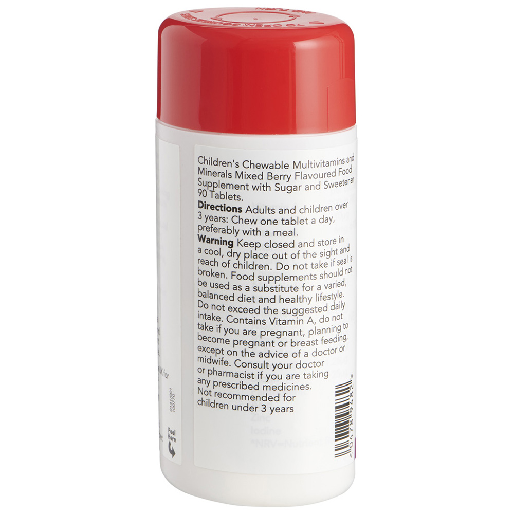 Our Children's Chewable Multi-Vitamins and Minerals Mixed Berry Food Supplement with sugar and sweetener provides a balanced combination of vitamins and minerals. Contains iodine for normal growth in children.