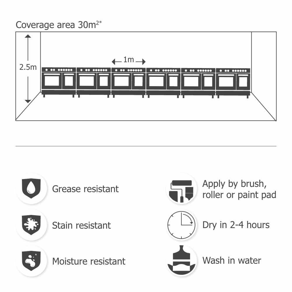 Wilko Kitchen Matt Emulsion Paint 2.5L is perfect for kitchens, where everyday grease and moisture can be a problem. This durable paint has been specially formulated to be washable and easy to clean. The best results always start with the best preparation. Clean walls with Wilko sugar soap. Ensure you have a smooth surface and the right rollers and brushes for the job. The contents of this can will cover approximately 30 square metres* which after 2 coats, is about the same width as 6 range cookers. (*Approximate coverage depends on the surface of your walls, see the back of can for more details). Colours viewed on screen may not show the same on your walls. To make sure this colour's right for you, we recommend ordering a tester pot or popping into store to check first.