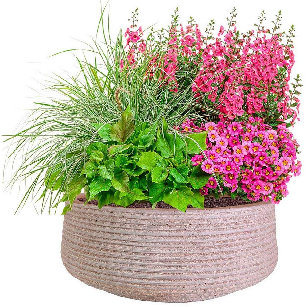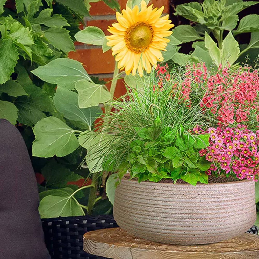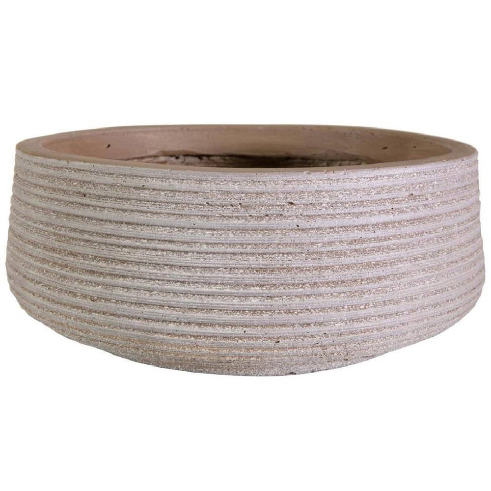 Enhance your outdoor space with our Large Ribbed Taupe Light Concrete Fibrestone Outdoor Bowl Plant Pot 12cm. Crafted with precision, the sleek design features composite construction and state-of-the-art finishing techniques. The use of Fibrestone adds both texture and style to your environment. While it mimics the appearance and feel of solid stone or concrete, it offers the practical advantages of fibreglass, all at a fraction of the weight and cost. It is designed to withstand demanding conditions and is ideal for nurturing plants from the outset. The pre-drilled holes prevent water retention, ensuring the health and vitality of your greenery. Whether placed indoors or outdoors, this statement plant bowl exudes simple elegance, making it a thoughtful gift for gardening enthusiasts. Dimensions: H12 x D31cm, 9L.