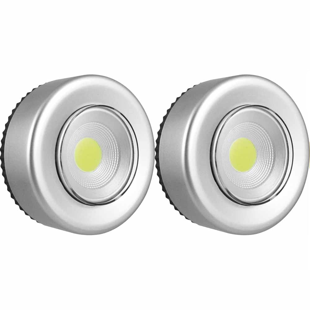 2 silver LED push lights. These easy to use LED push lights use long-lasting, ultra bright LEDs and come ready to use with batteries included. So easy to install; simply remove the backing from the adhesive pad and stick into place! To switch on or off, all you have to do is push. Each push light requires 3 x AAA batteries. Warning: For indoor use only. Keep out of reach of children. Always read the label before use.