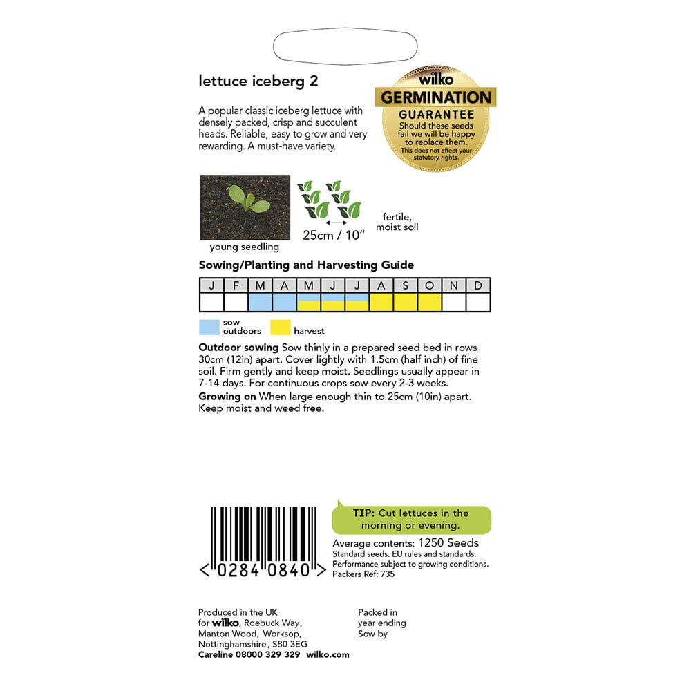 Grow healthy salads in your garden and eat fresh with our Iceberg Lettuce Seeds. Easy to grow, this pack of seeds produce a classic variety of lettuce with densely packed, crisp and succulent heads. They're reliable and easy to grow, which makes them a very rewarding crop. Sow outdoors from March to July, ready to harvest from May to October. The average pack contains 1250 seeds.