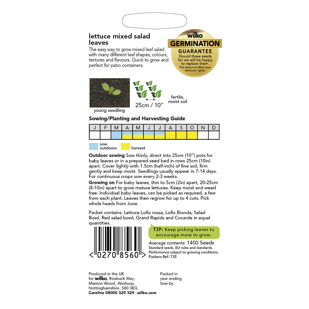Lettuce is one of the finest ingredients of a healthy salad mix. Grow our Lettuce Mix Salad Leaves Seeds in your backyard in a quick time. They produce different leaf shapes, colours, textures and flavours. You can sow the seeds around patios or in containers and pick the lettuce leaves whenever you need. Sow outdoors from March to July, ready to harvest from April to October. The average pack contains 1400 seeds.
