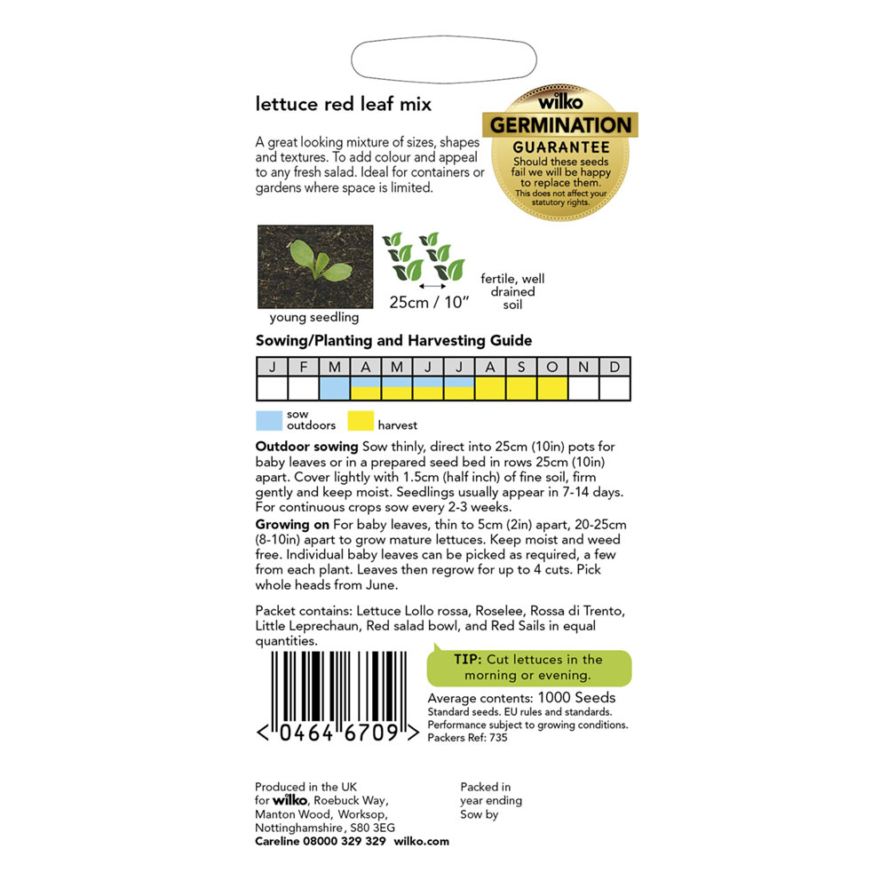 Grow fresh produce at home with our Lettuce Red Leaf Seeds. It produces a great-looking mixture of leaves in a variety of sizes, shapes and textures. These lettuce red leaves add lots of colours and appeal to any fresh salad. They're also ideal for adding a unique touch to your patio containers. Sow outdoors from March to July, ready to harvest from April to October. The average pack contains 1000 seeds.
