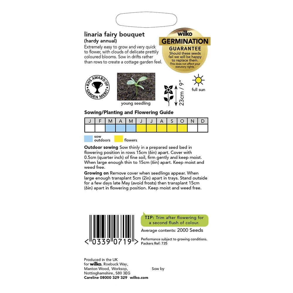 Our Linaria Fairy Bouquet produces clouds of delicate and pretty coloured blooms. The seeds germinate quickly, which makes them a preferred choice. These flowers are perfect for sowing in drifts rather than straight rows for a lovely informal cottage-garden feel. A hardy annual variety. Sow outdoors from March into May, ready to enjoy the blooms of colour from June to October. The average pack contains 2000 seeds. Height: 23cm.