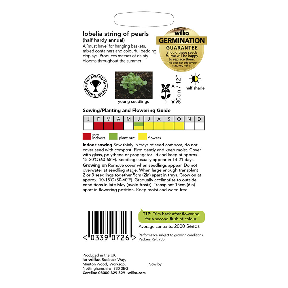 Lobelia String of Pearls Seeds produce masses of dainty blooms throughout the season. They are suitable for hanging baskets, mixed containers and colourful bedding displays. A dazzling mix of a variety of colours creates an attractive point in the garden. A half-hardy annual. Sow indoors from February into April, ready to enjoy beautiful blooms from June to October. The average pack contains 2000 seeds. Height: 15cm.