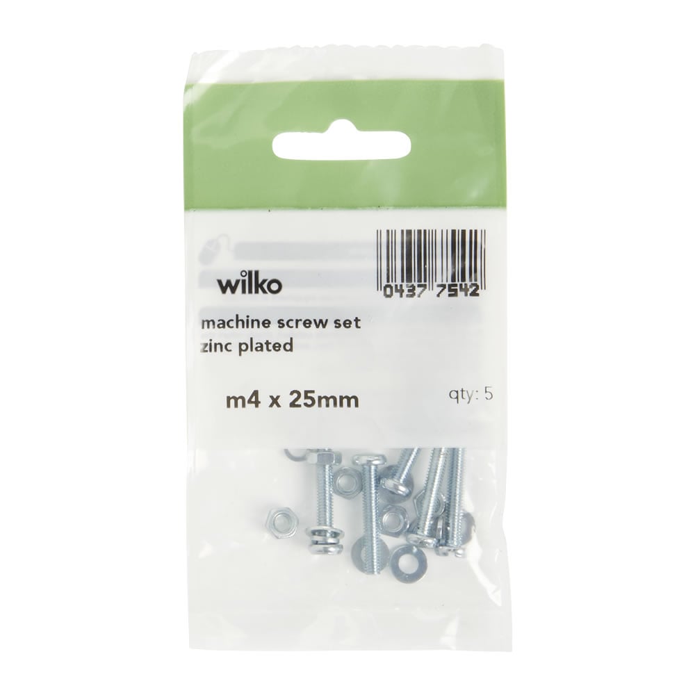 Get your DIY to-dos done with our zinc plated machine screw set. The screw set comes with washers and nuts. The set contains five nuts, five spring washers and five machine screws. Size: M4 x 25mm.