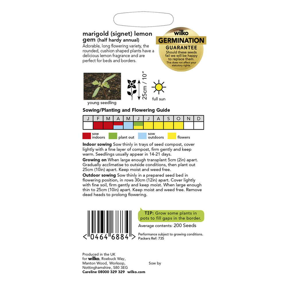 Our Marigold Lemon Gem Seeds produce easy-to-grow plants that form lovely rounded cushions of fine, citrus-scented leaves covered in a mass of bold yellow flowers and blooming non-stop all summer long. A delight in summer beds, borders and containers. Sow indoors from February to April or outdoors from April to May, ready to flower from June to October. The average pack contains 200 seeds. Height 25cm.