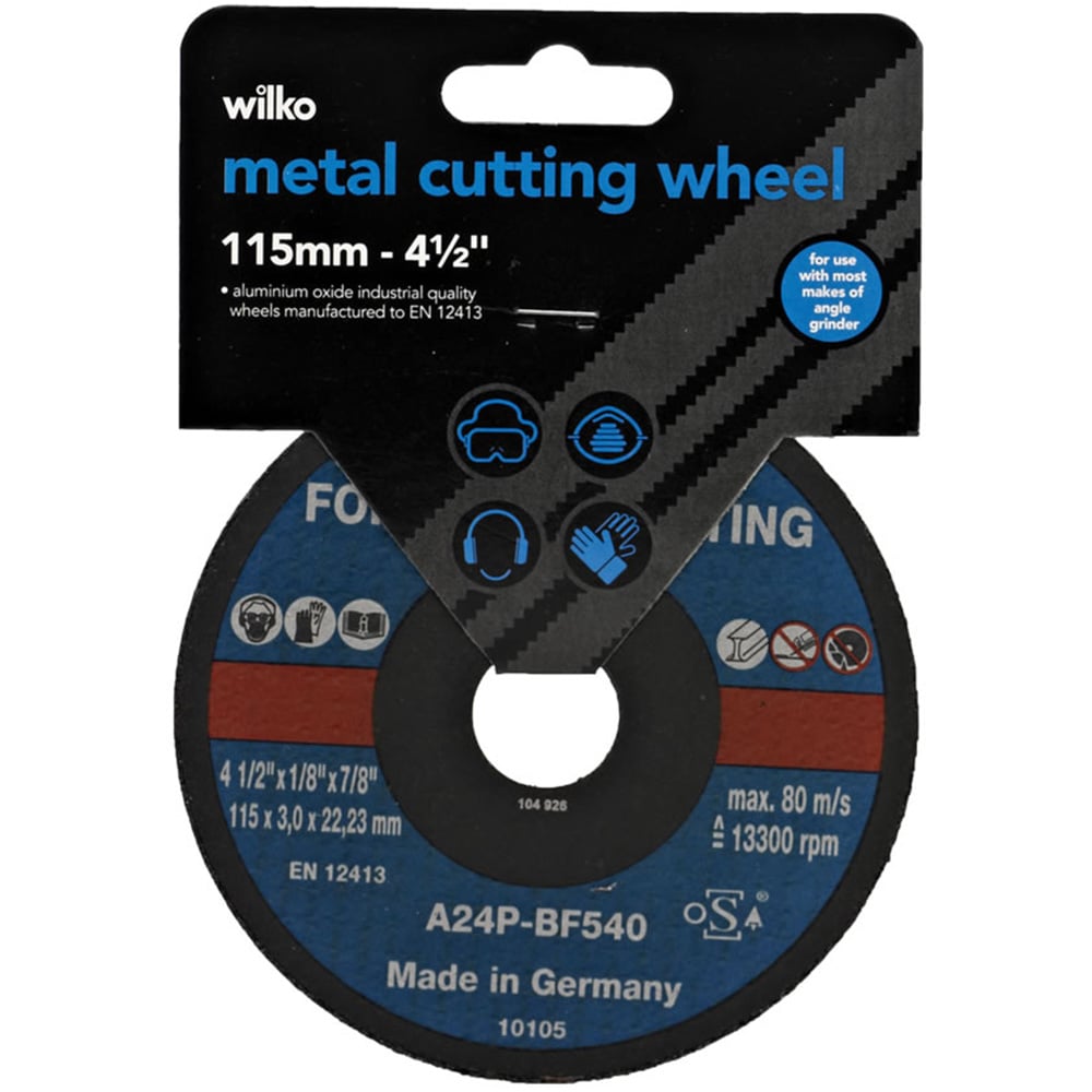 A Wilko Metal Cutting Wheel for use with most angle grinders. Made from industrial quality aluminium oxide. Always read instructions.