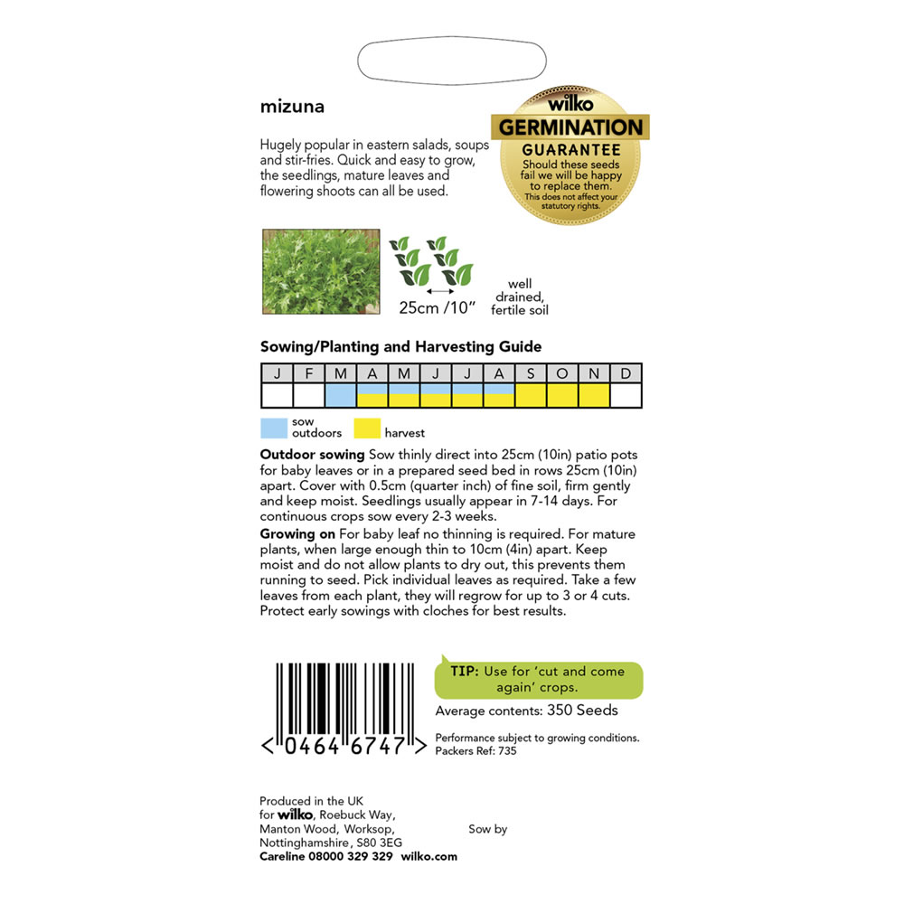 Grow fresh produce at home with our Mizuna Seeds. Quick and easy to grow - the finely cut leaves and flowering shoots can all be used, which is why they're hugely popular for eastern-style salads, soups and stir-fries. Perfect for growing in raised beds and patio containers. Sow outdoors from March to August, ready to harvest from April to November. The average pack contains 350 seeds.