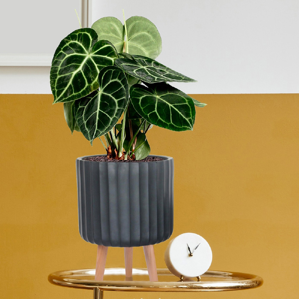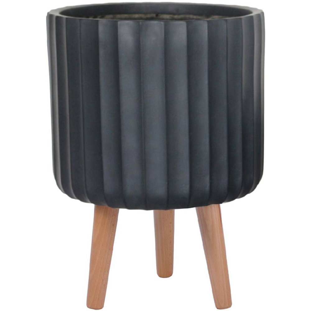 Elevate your indoors with lively plants and stylish plant pots with our Modern Ribbed Black Indoor Cylinder Plant Pot with Legs 32cm. It is crafted from strong and durable material, this modern round planter is ideal for indoor use. Whether placed in your yard, garden, terrace, veranda, porch, or outdoor commercial area, it adds a touch of elegance. The ribbed surface of this round cylinder planter complements any room style. It's natural appearance and weather-resistant material make it a cool choice for outdoor spaces. The sturdy wooden legs serve as an integrated plant stand. Please note that slight surface imperfections are part of the artisan-like creative process. Dimensions: H32 x W 24 x D24cm, 7.6L.