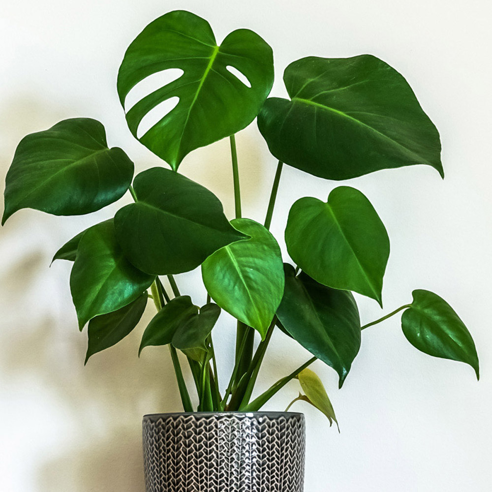 If there is one houseplant that has inspired generation after generation of indoor gardeners, then it has to be the ever-popular and easy-to-grow Swiss cheese plant, Monstera Deliciosa. With glossy, rich green leaves with irregular holes, plants will trail gently over their pot if left untrained or can be treated as a climber and tied to a support. The glossy, tropical leaves of the monkey leaf are what make this plant a star, easily adding a lush, exotic feel to any room. It's fascinating to watch the young leaves as they emerge tightly furled, growing longer each day before opening fully. Young leaves are solid, but as the plant matures, they begin to develop the characteristic holes. Naturally a lazy climber, your plant will enjoy the support of a moss pole, not supplied, where you can push its aerial roots into the moss as they develop, helping to support it as it grows. A native of tropical rainforests, Monstera is a houseplant that's easy to keep happy. It is recommended that you place it in bright but not direct sunlight indoors and mist the leaves regularly to provide humidity. They love a bit of a leaf wipe now and again to remove dust and restore that glossy sheen. Supplied as an established plant in a 4L pot, approx. 60-80cm tall. As with all houseplants, keep away from children and pets and take care when handling. Please note that the decorative pot is not included.