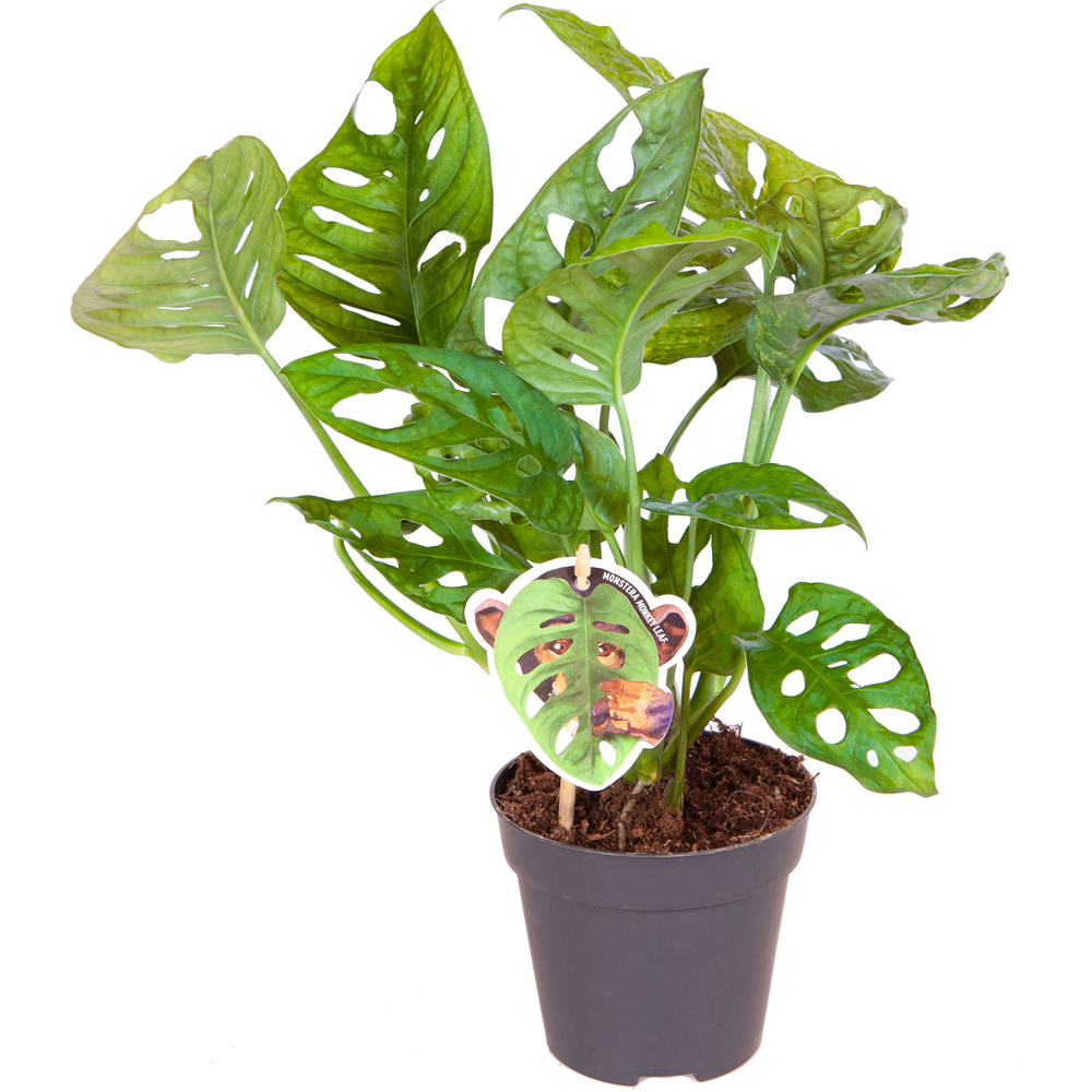 Elevate your indoor garden with our Monstera Monkey Leaf with Espresso Recycled Pot Cover 12cm. This plant is a new version of the Swiss Cheese Plant, known for being more compact and low-maintenance. It has glossy, rich green leaves with irregular holes and elegantly trailing stems. The leaves have a lush, tropical appearance. It's easy to grow and brings the health benefits of having houseplants to your living space. You can either let this plant climb or tie it to a support. The leaves start whole when young but develop characteristic holes over time. The plant is a lazy climber and does well with the support of a moss pole (not included). Monstera plants, native to tropical rainforests, thrive in bright, indirect sunlight indoors. It's important to mist the leaves regularly for humidity and wipe them occasionally to remove dust and restore their glossy sheen. For a beautiful display, you can place this houseplant into the provided Magnolia Eco Coffee Espresso pot cover. This pot cover is practical and easy to use - just put the Monstera, including the nursery pot, into the cover without any hassle or mess. The pot cover is made of 100% recycled materials, including wood shavings and coffee husks, with natural raw materials making up to 40%. The Monstera plant is supplied in a nursery pot with a 12cm diameter, and it comes with a 14cm pot cover. It grows to a height of 100cm and a width of 40cm.