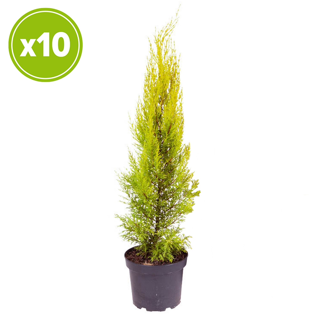 Discover a new way to enjoy nature with the YouGarden Monterey Cypress Goldcrest Plant Pot 10.5cm 10 Pack. These are an ideal choice for anyone looking to create a beautiful hedge in their garden. Each plant features bright golden-yellow foliage that stays vibrant in your garden all year round. Over time, the Monterey Cypress Goldcrest, also known as Cupressus macrocarpa, can grow to a height of three to five meters within ten years and can reach up to ten metres in height in 20 years. Their tall, columnar shape makes it perfect for hedging, providing a neat and attractive boundary in your garden. These conifers are known for being very easy to grow and maintain. They are winter-hardy, which means they can withstand colder temperatures without any issues. A simple prune is all that is needed to keep them looking their best. You will receive ten established plants, each in 10.5cm pots, making it easy to plant them out. For optimal growth, it is recommended to space the plants around 70-90cm. The final dimensions will be 1000 x 400cm, making it a striking feature in any landscape. Please note that the images of the plants shown are for height reference only.