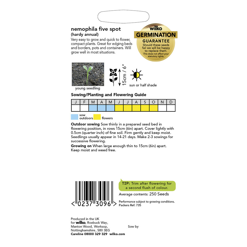 Create a stunning outdoor area easily with our Nemophilia Five Spot Flower Seeds. Easy to grow, these seeds flower quickly and produce lovely blooms for your garden displays. Suitable to grow in borders, flower beds and containers, these compact flowers with distinct purple spots grow well in most situations. A hardy annual. Sow outdoors from March to May, ready to flower from June to October. The average pack contains 250 seeds. Height: 15cm.