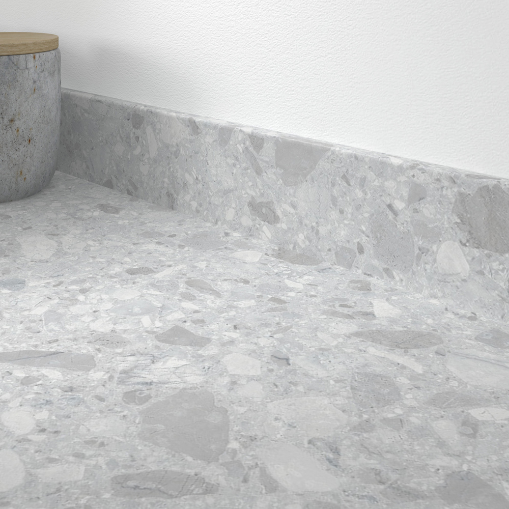 A realistic light grey terrazzo, Nuvolento is a laminate Upstand that looks and feels like stone composite thanks to lifelike details and a rough texture, making it ideal for timeless family kitchen designs.