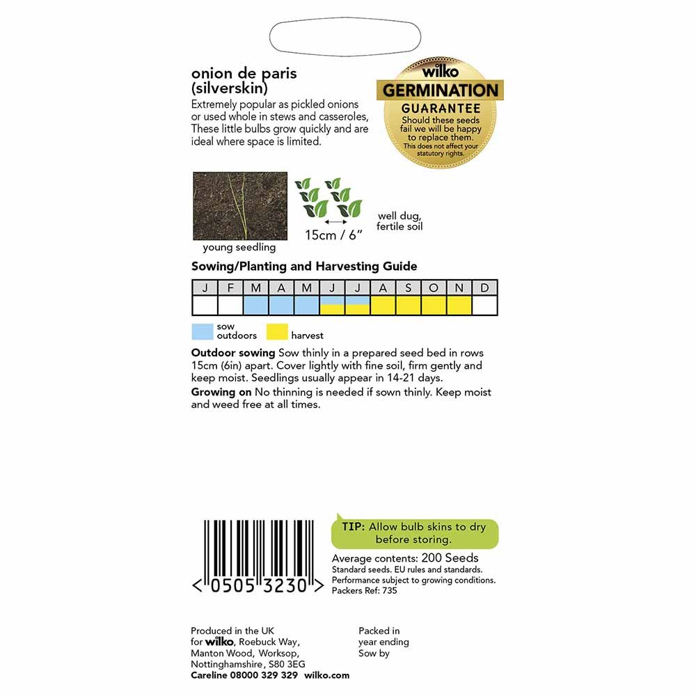 Enjoy an easy and quick gardening experience with our onion de Paris seeds. Perfect for small areas, plant these seeds in your gardens and relish fresh veggies for broths and salads. Sow between March to July for optimum results and growth. The average pack contains 200 seeds. Directions to use: Outdoor sowing - Sow thinly in a prepared seed bed in rows 15cm (6in) apart. Cover lightly with fine soil, firm gently and keep moist. Seedlings usually appear in 14-21 days.