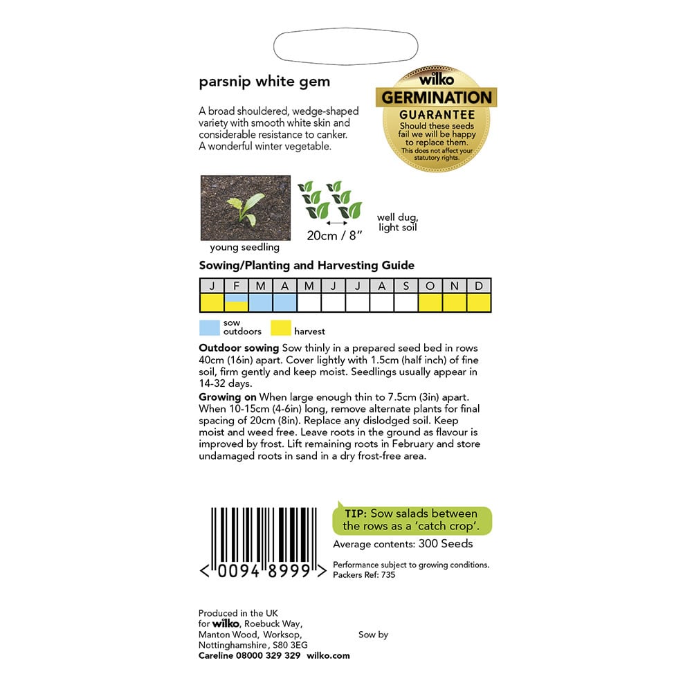 Make a vegetable-friendly garden with our Parsnip White Gem Seeds. Our Parsnip White Gem Seeds produce a broad-shouldered, wedge-shaped variety with smooth white skin. This crop has considerable resistance to canker, making it a wonderful winter vegetable for creating warming soups and roast dinners. Sow outdoors from February to April, ready to harvest from October to February. The average pack contains 300 seeds.