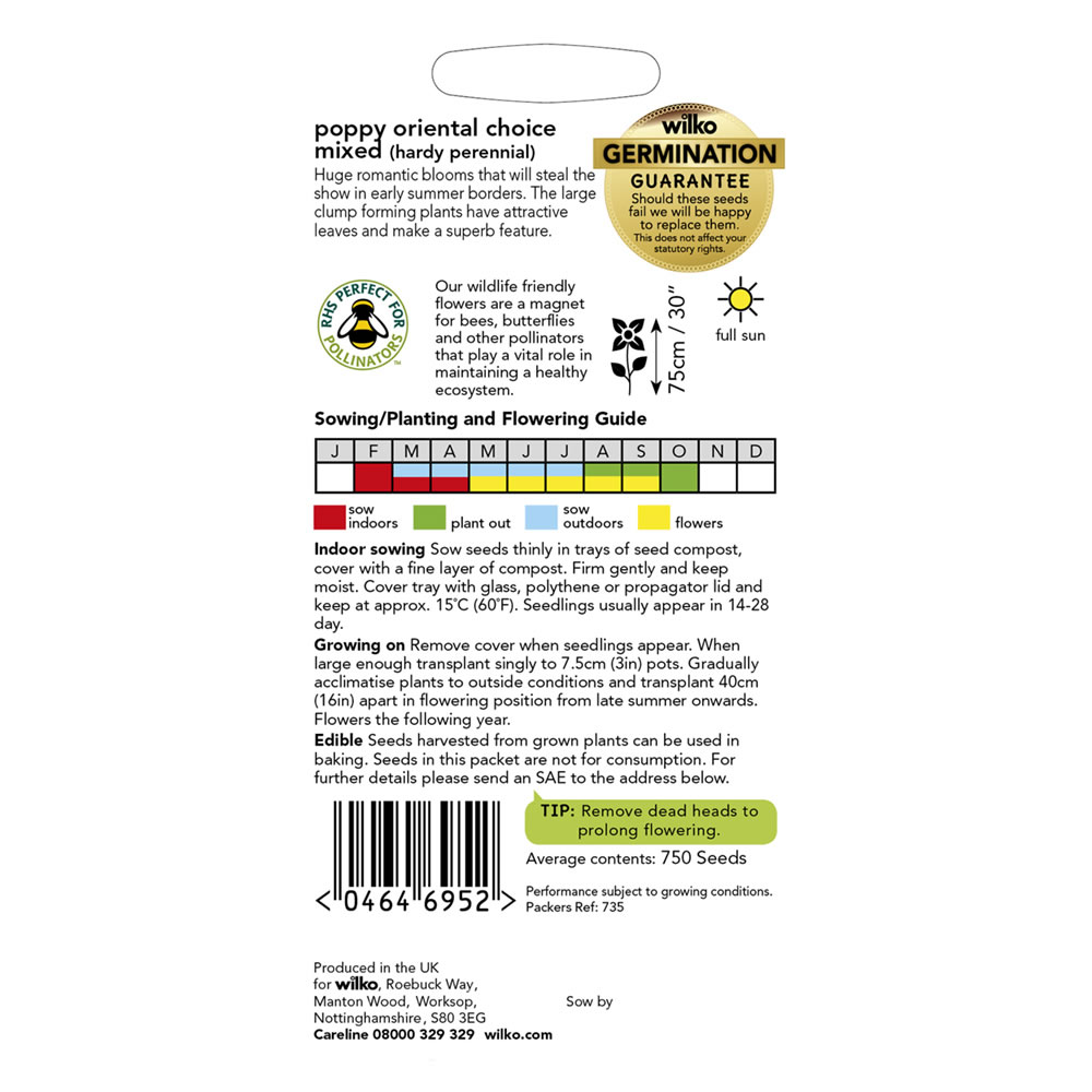 Our Poppy Oriental Choice Mixed Seeds produce huge, romantic-looking blooms that are guaranteed to steal the show. These spectacular flowers are followed by large and attractive seed pods. The large clump-forming plants have attractive, finely cut leaves and make superb feature plants. Sow indoors from February to April or outdoors from March to July, ready to flower from May to September. The average pack contains 750 seeds. Height 75cm.