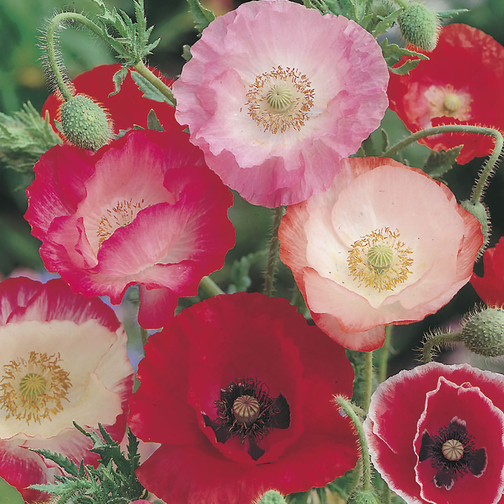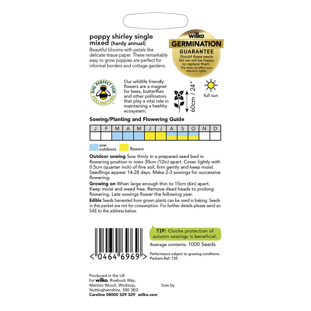 Our Poppy Shirley Single Mixed Seeds produce beautiful blooms with petals that look like they're made of fine tissue paper and stir in the breeze. These remarkably easy-to-grow poppies are perfect for informal borders and cottage gardens. Sow outdoors from March to May and August to October, ready to flower from June to October. The average pack contains 1000 seeds. Height 60cm.