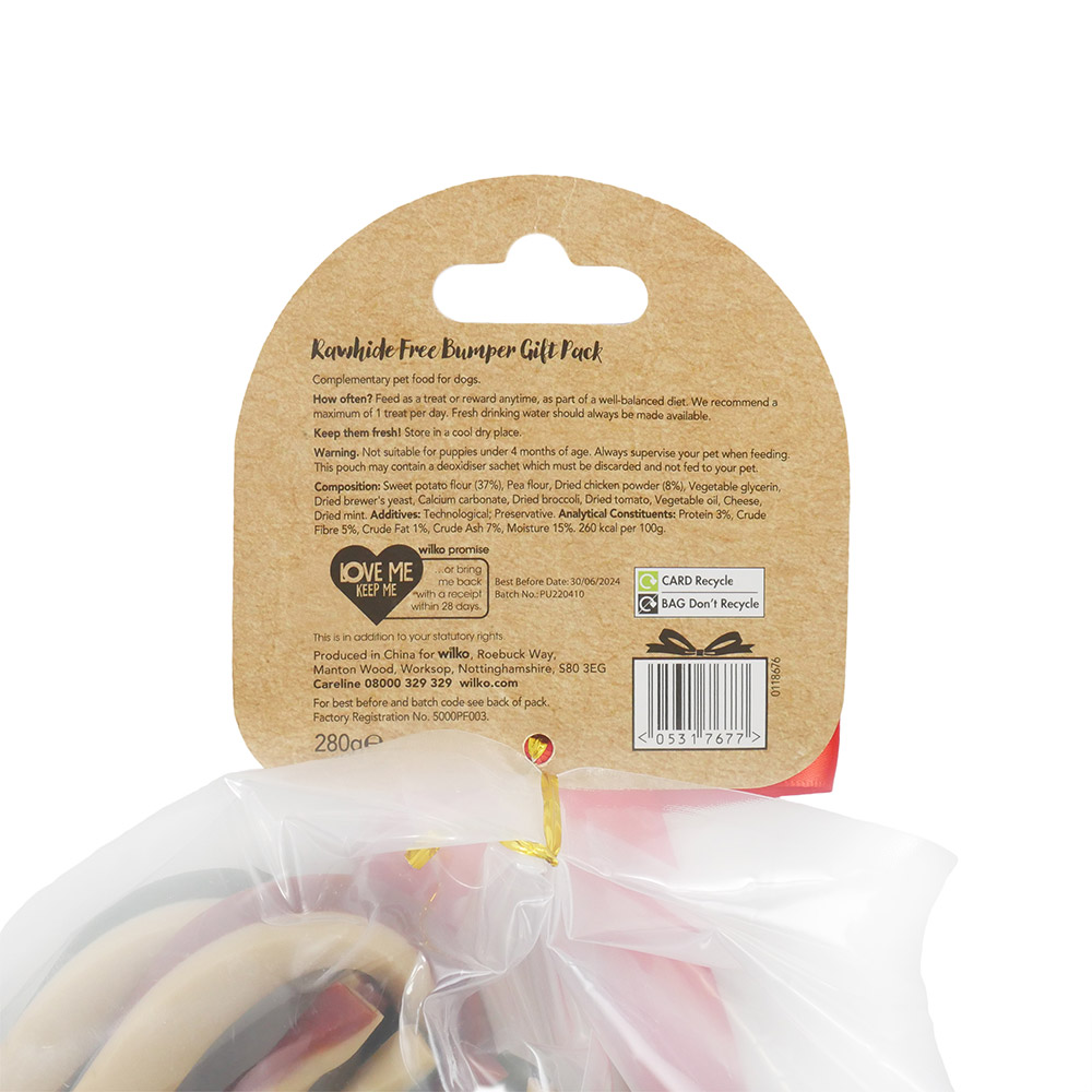 Delight your pet this festive season with our Rawhide Free Bumper Gift Pack. The pack contains two tasty flavour festive sticks to keep your pooch entertained and satisfied. Including delicious cranberry and refreshing mint to help with fresh breath - it is both rawhide, grain and gluten-free. These tasty treats are made with real meat and vegetables! Pack size: 280g.
