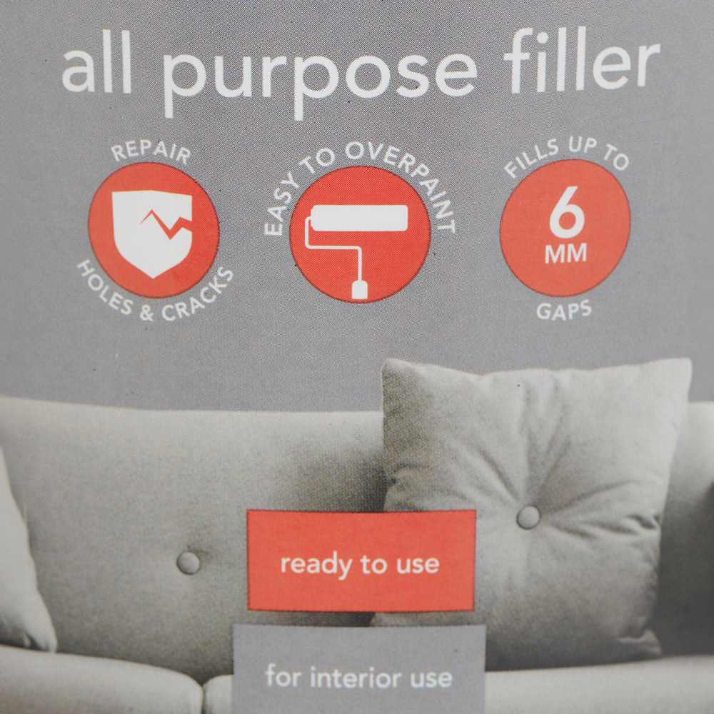 Repair holes and cracks with our Ready Mixed All Purpose Filler. Our all-purpose interior filler is suitable for indoor repairs to plaster, plasterboard, wood, brick and stone. Once dry, it can be sanded, painted, drilled or plugged. The filler is crack and shrink resistant. It will fill holes and cracks up to 6mm. Easy to overpaint. Directions for use: Stir filler thoroughly before use. Ensure surfaces to be filled are clean, dry, sound and free from grease and dust. Touch in nails and screw heads with oil-based paint to prevent rusting. Only apply filler to a thickness of approximately 5mm in one application and allow to harden (for 24 hours) before adding another layer if required. Push the filler into the area to be repaired using a filling knife or scraper, and press into cavities. Finish with a slightly wet filling, knife or scraper so that the filler is level with the surrounding surface. Once hardened, use fine sandpaper to blend in the repair. The surface may then be painted or decorated as required. Replace lid after use. Clean tools with water before filler sets hard. Stone in a frost-free place. Size: 2.5kg.