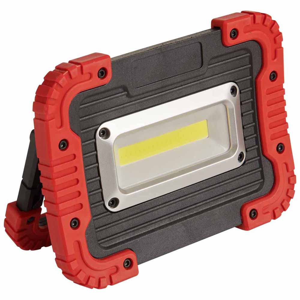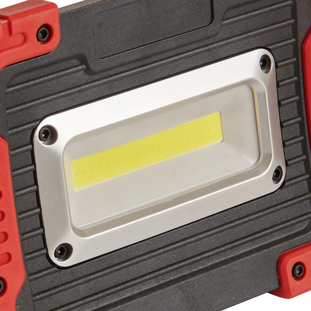 Work in dark conditions efficiently with our finely crafted Rechargeable Work Light. The light features a powerful 10W COB LED that is powered by a 3.7V, 4400mAh Li-ion rechargeable battery. It features high, low and flashing light setting and also a USB output to charge other devices. It has a low battery indicator and comes with a USB cable that charges. A full charge will take approximately six hours and provide up to three hours of light on high power. With an adjustable stand and carry handle, it is the perfect light for DIY, camping, in the car and to use all around the home. Note: Timings variable depending on capacity and type of batteries used.