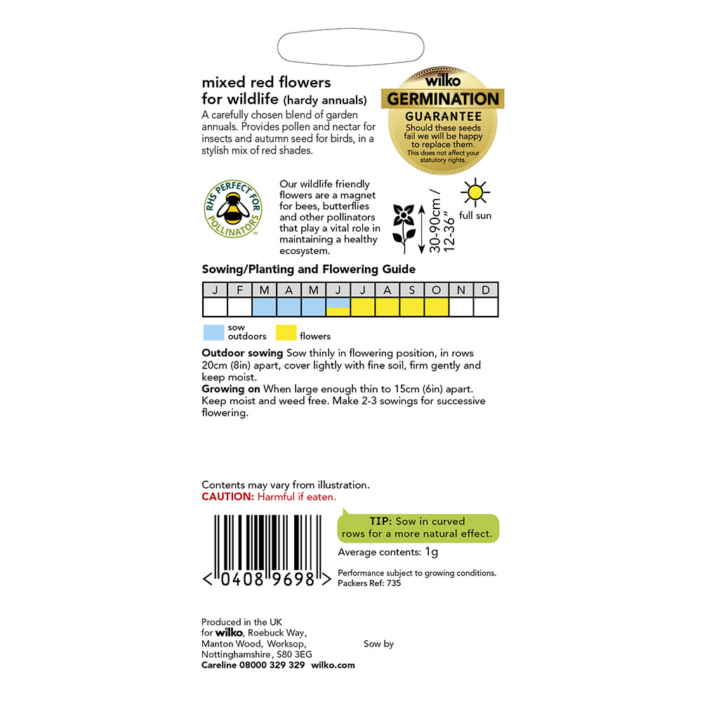 Attract bees and pollinators to your garden with our Red Flowers for Wildlife Mix Seeds. Our Mixed Red Flowers for Wildlife Seed Mix has been specially designed to provide pollen and nectar for insects and autumn seeds for birds. In a stylish mix of red shades, these are perfect for adding to cottage style or wild gardens. Repeat sow in beds and borders for summer-long displays. Hardy annuals. Sow outdoors from March to June, ready to flower from June to October. The average pack contains 1g of seeds. Height: 30-90cm.