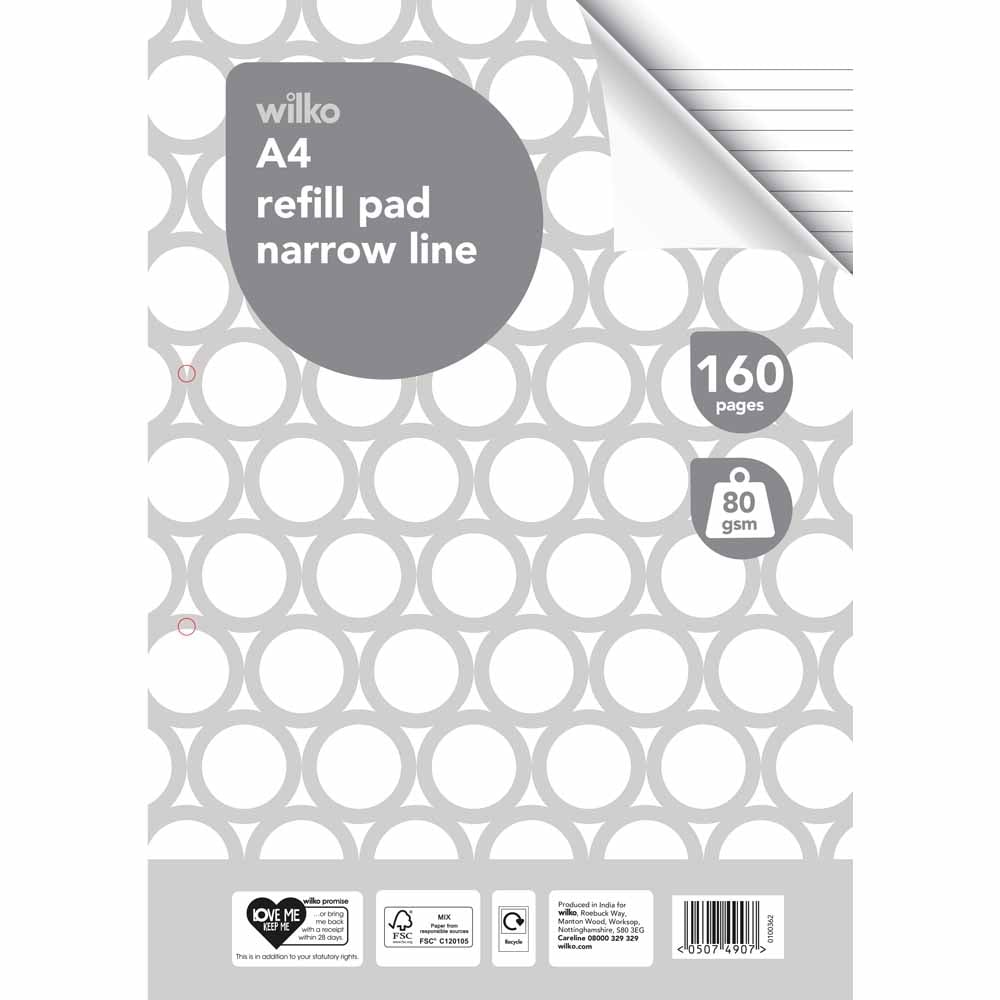 Our A4 narrow lined refill pad is ideal for schoolwork, college work or taking notes. This refill pad contains 160 sheets of 80gsm paper with hole punches for filing.