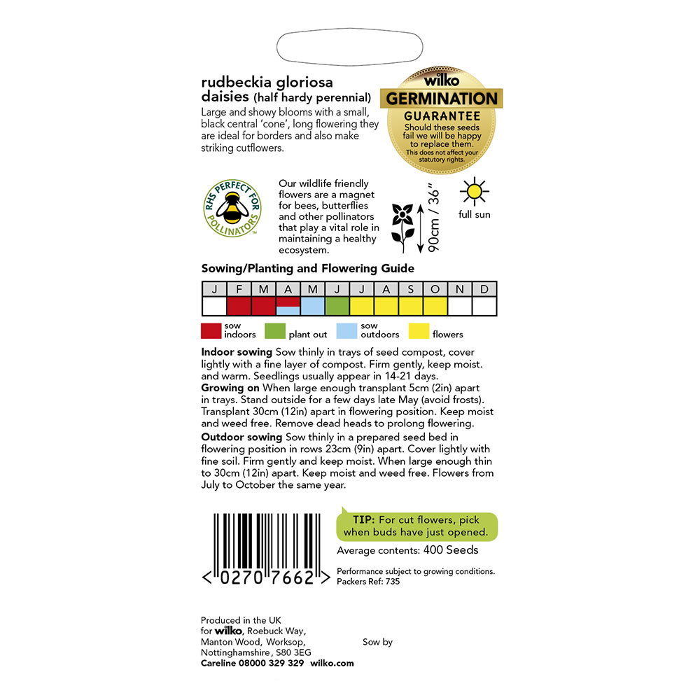 Beautify your garden with large and showy blooms of Rudbeckia Gloriosa Daisies. They produce flowers in orange and yellow with black cones at the centre. These are ideal for borders as well as make for a great choice for striking cut flowers. The beautiful flowers attract bees, butterflies and pollinators in good numbers. A half-hardy perennial. Sow indoors from February to April or outdoors from April to May, ready to flower from July to October. The average pack contains 400 seeds. Height 90cm.