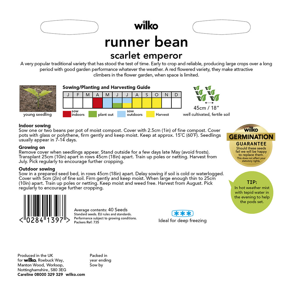 Our Runner Bean Scarlet Emperor Seeds are a very popular and traditional variety that has stood the test of time. Early to crop and reliable, these seeds produce large crops over a long period with good garden performance whatever the weather. A red-flowered variety, they make attractive climbers in the flower garden when space is limited. Sow indoors from April or sow outdoors from May to early July, ready to harvest from July to October. The average pack contains 40 seeds. The seeds come with a germination guarantee and should they fail, we will be happy to replace them. This does not affect your statutory rights.