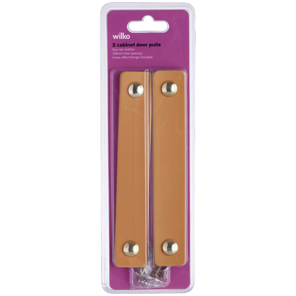 Give your furniture a new look with our pack of two Scandi Tan Faux cabinet door pulls. The handles with a brass effect finish and faux tan leather will bring a modern touch to a range of furniture around the home. Our cabinet door pulls are replacement pulls for kitchen cabinets, wardrobes and furniture around the home. Fixings included. They have 128mm hole spacing. Care and use: To affix the cabinet door pulls, an approximate hole spacing of 128mm is required. Wipe clean with a soft, damp cloth. Do not use harsh or abrasive cleaners/scourers.