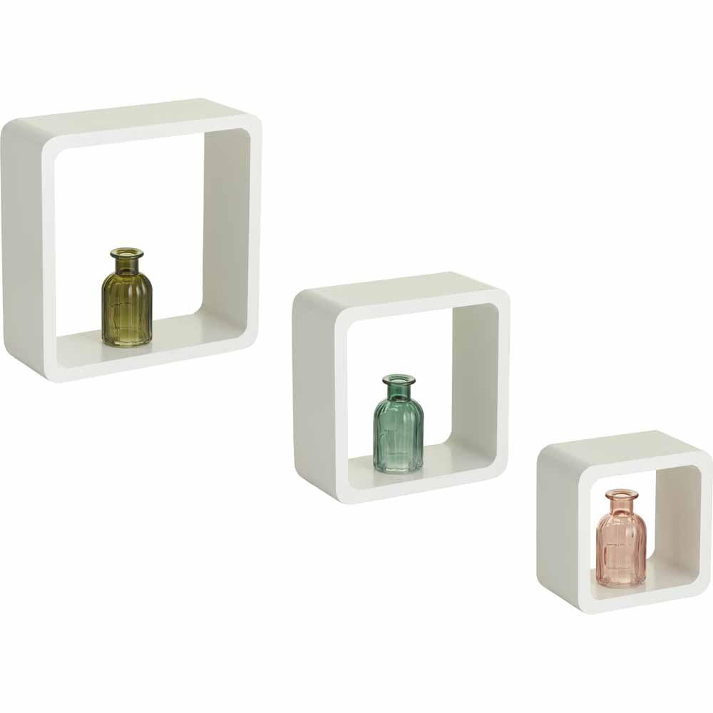Create a perfect storage space or a stylish feature for your room with our Set of 3 MDF Cube Shelves White. These modern cube shelves are ideal for decorating wall space with books, photo frames and ornaments. MDF thickness: 1.5cm. Dimensions: Sizes approximately: Small 17 x 17 x 10 cm, Medium 22 x 22 x 10 cm, Large 27 x 27 x 10 cm. Care and Use: Wipe clean with a soft cloth and mild cleaner. Avoid harsh or abrasive cleaners and scourers as these may damage the finish.