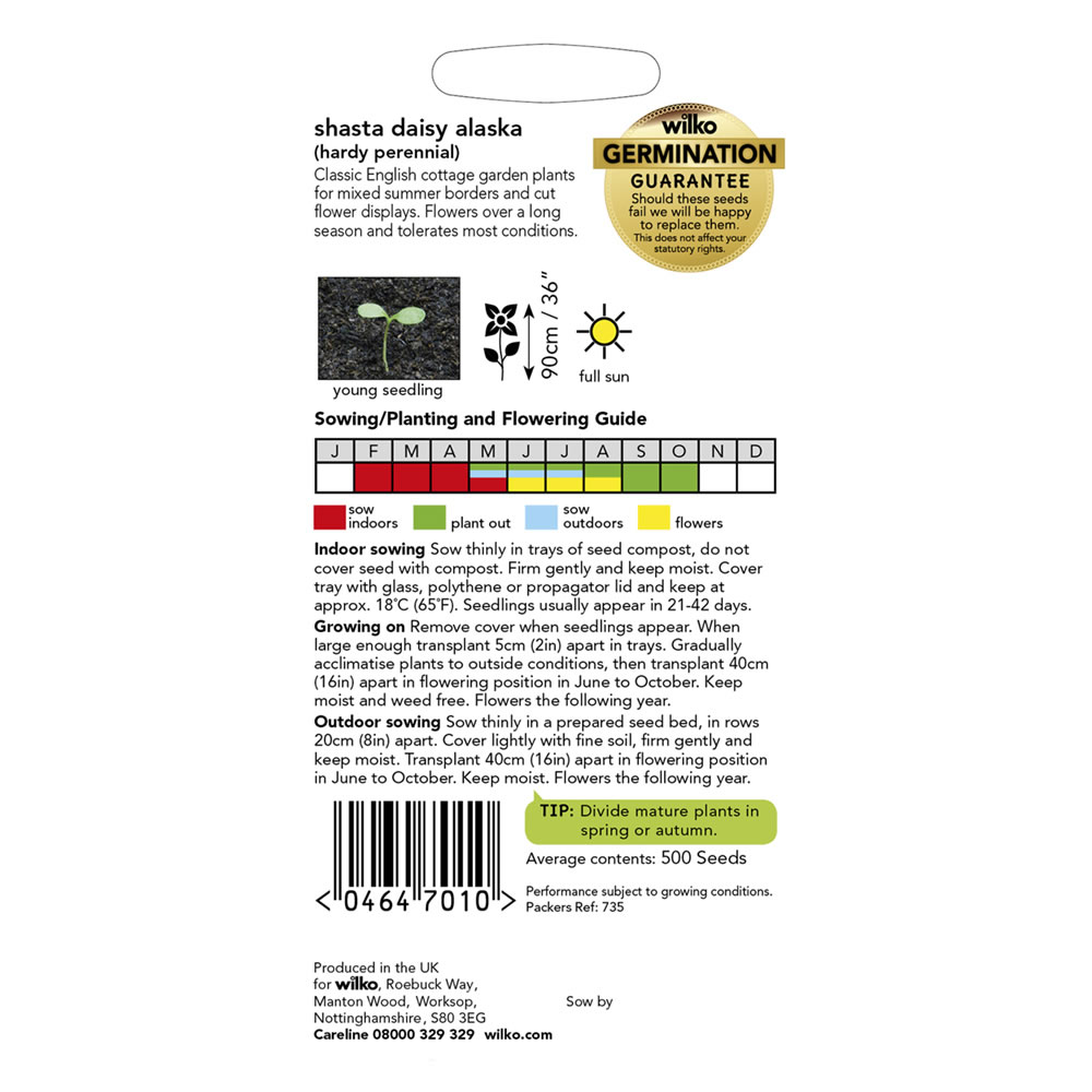 Our Shasta Daisy Alaska Seeds produce traditional English cottage garden plants. They're perfect for creating elegant summer borders and classic cut flower displays. The plants flower over a long season on vigorous, clump-forming plants that tolerate most conditions. A hardy perennial. Sow indoors from February to May or outdoors from May to July, ready to flower from June to August. The average pack contains 500 seeds. Height 90cm.