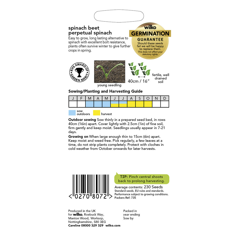 If you are looking for a spinach variety that can survive winters and give you harvest in spring, pick our Spinach Beet Perpetual Seeds. With tasty, tender leaves, this is easy to grow and is one of the best alternatives to regular spinach. They can be used in the same way as spinach. Plants may also survive the winter to give a further crop in spring. It is the winner of the prestigious RHS Award of Garden Merit. Sow outdoors from March to July, ready to harvest from June to October. The average pack contains 230 seeds.