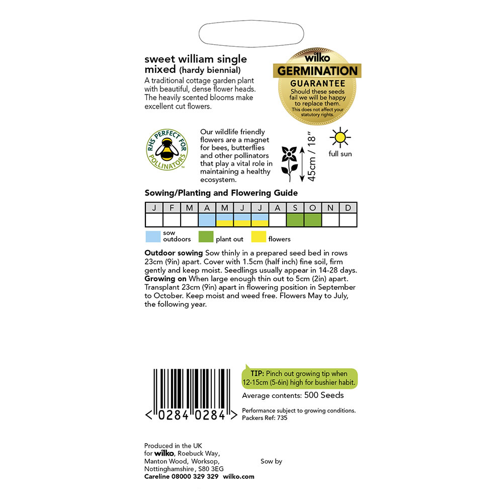 Brigthen up your garden with our Sweet William Single Mixed Seeds. These heavily scented blooms of pink and red flowers make excellent cutting flowers. Sow outdoors from April to July, ready to flower from May to July. The average pack contains 500 seeds. Height: 45cm.
