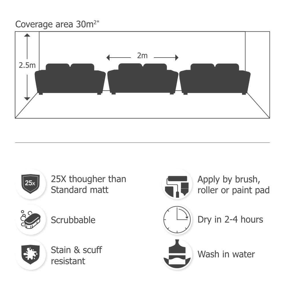 Wilko Tough & Washable Matt Emulsion Paint 2.5L is 25 x tougher than standard matt emulsion, providing an outstanding finish on walls, ceilings, wood and metal. Drying in 2 to 4 hours, this easily washable, scuff resistant paint is perfect for pet owners and busy families, allowing you to remove stubborn marks without damaging the finish. The best results always start with the best preparation. Clean walls with Wilko sugar soap. Ensure you have a smooth surface and the right rollers and brushes for the job. The contents of this can will cover approximately 30 square metres* which after 2 coats, is about the same width as 3 small sofas. (*Approximate coverage depends on the surface of your walls, see the back of can for more details). Colours viewed on screen may not show the same on your walls. To make sure this colour's right for you, we recommend ordering a tester pot or popping into store to check first.