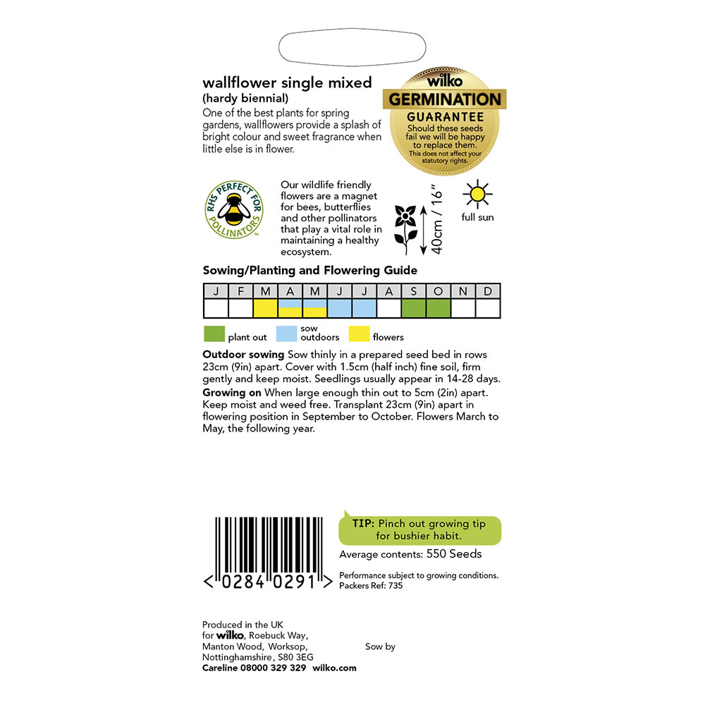 Add colour to your garden with our Wallflower Single Mixed Seeds. It produces a splash of bright colours in red, yellow and orange with a sweet fragrance. Sow outdoors from April to July, ready to flower from March to May, the following year. The average pack contains 550 seeds. Height: 40cm.