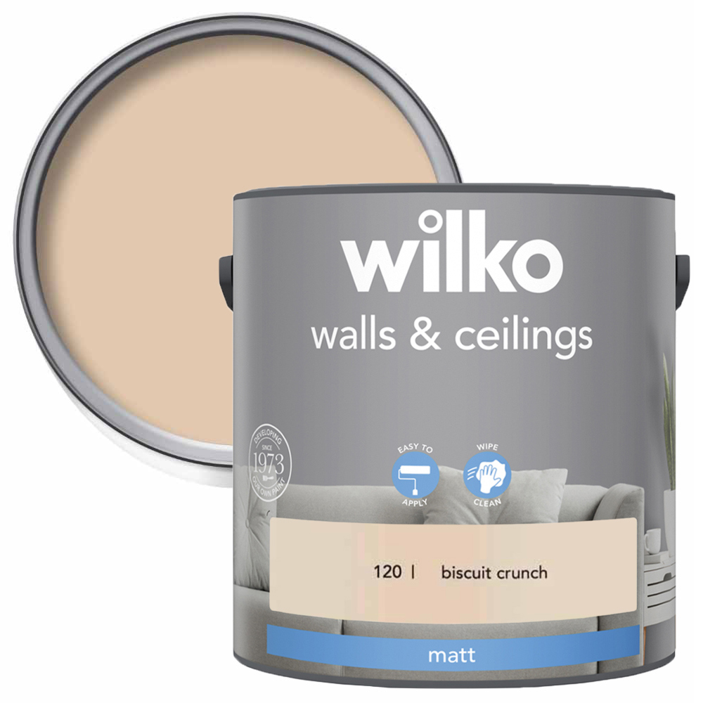 Renovate your home with our Walls and Ceilings Matt Emulsion Paint 2.5L. Our matt emulsion paint gives you that perfect finish for a modern look. This attractive colour dries in two to four hours and gives a modern, matt finish. This paint covers slight imperfections like lumps or bumps on your wall in just two coats. The contents of this can will cover approximately 35 square metres, which after two coats, is about the same width as three small sofas. (Approximate coverage depends on the surface of your walls, see the back of the can for more details). Colours viewed on the screen may not show the same on your walls. To make sure this colour's right for you, we recommend ordering a tester pot or popping into the store to check first. Shade: Biscuit Crunch.