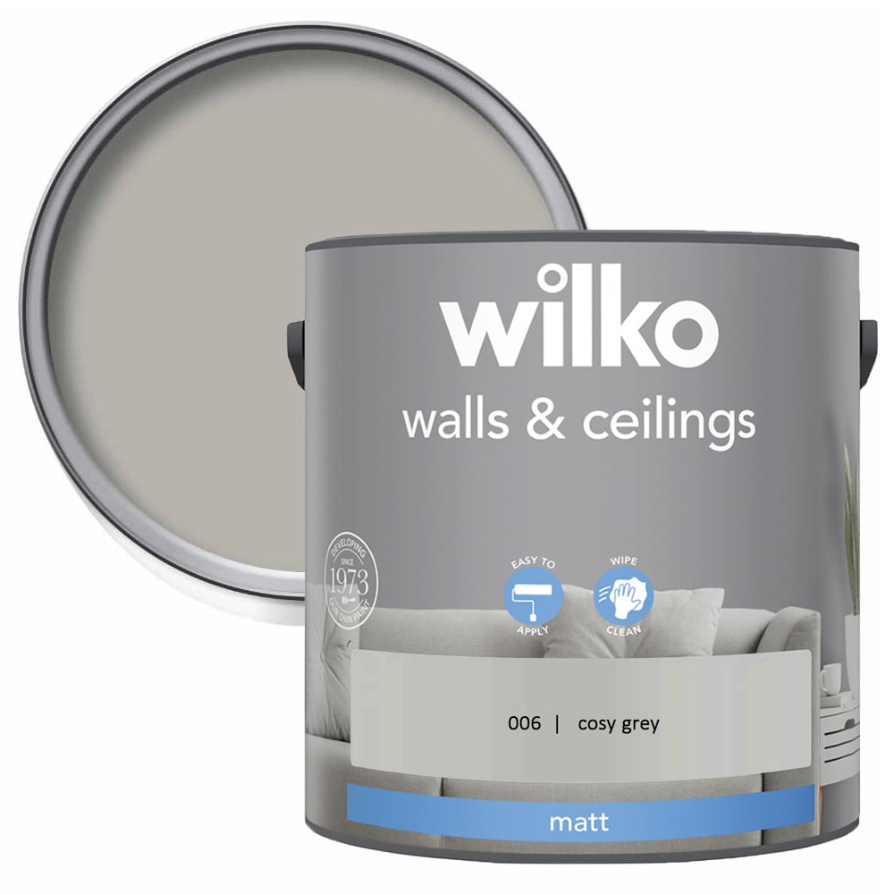 Renovate your home with our Walls and Ceilings Matt Emulsion Paint 2.5L. Our matt emulsion paint gives you that perfect finish for a modern look. This attractive colour dries in two to four hours and gives a modern, matt finish. This paint covers slight imperfections like lumps or bumps on your wall in just two coats. The contents of this can will cover approximately 35 square metres, which after two coats, is about the same width as three small sofas. (Approximate coverage depends on the surface of your walls, see the back of the can for more details). Colours viewed on the screen may not show the same on your walls. To make sure this colour's right for you, we recommend ordering a tester pot or popping into the store to check first. Shade: Cosy Grey.