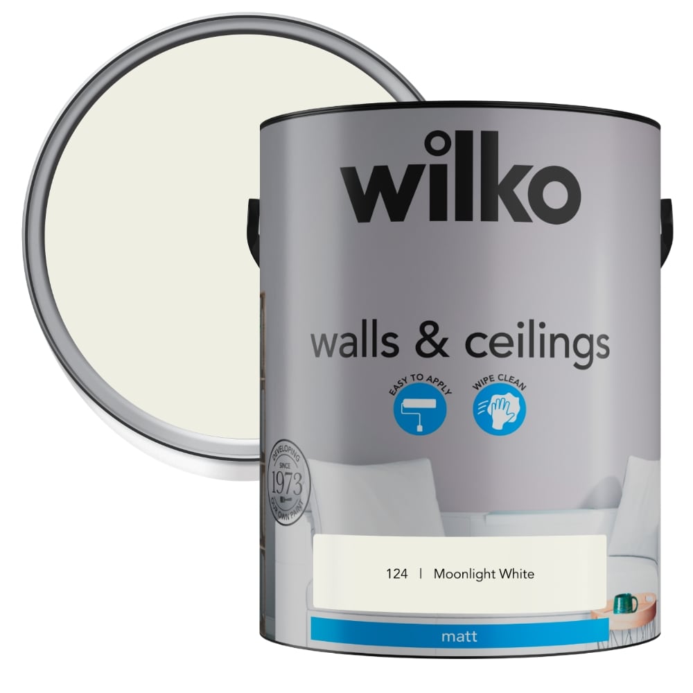 Renovate your home with our Walls and Ceilings Matt Emulsion Paint 5L. Our matt emulsion paint gives you that perfect finish for a modern look. This attractive colour dries in two to four hours and gives a modern, matt finish. This paint covers slight imperfections like lumps or bumps on your wall in just two coats. The contents of this can will cover approximately 70 square metres, which after two coats, is about the same width as seven small sofas. (Approximate coverage depends on the surface of your walls, see the back of the can for more details). Colours viewed on the screen may not show the same on your walls. To make sure this colour's right for you, we recommend ordering a tester pot or popping into the store to check first. Shade: Moonlight White.