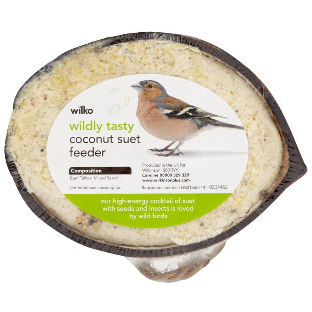 Our wildly tasty coconut suet feeder is a high energy cocktail of suet with seeds and insects that is loved by all wild birds. Simply use the string included to hang anywhere in the garden. Composition: Beef Tallow, Mixed Seeds. Allergen warning: Produced in a factory that handles nuts. May contain nuts or other tree nuts.