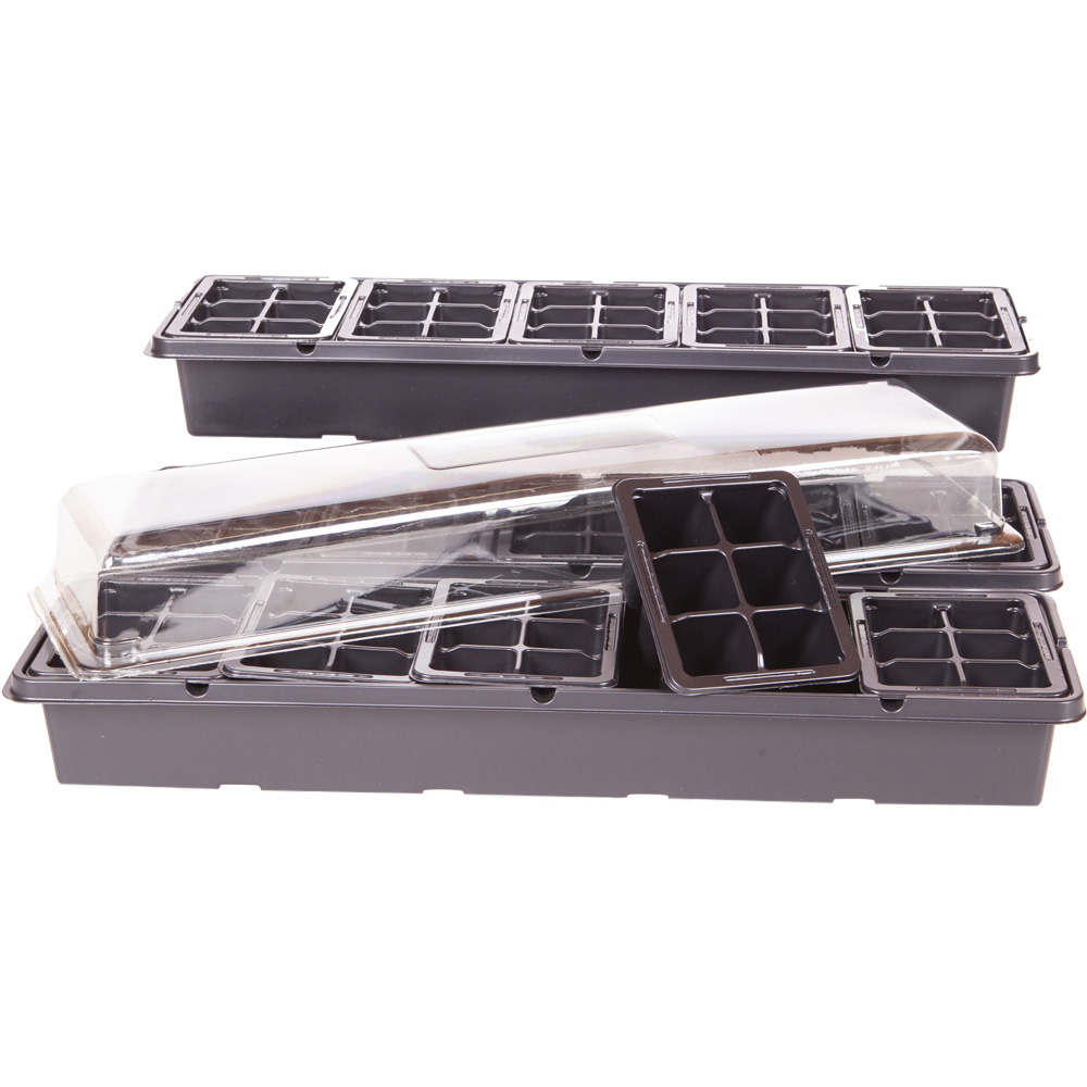 Grow happiness indoors with the YouGarden Windowsill Propagator Kits. These kits are the perfect environment to grow on plugs and seedlings before you plant them out into your garden. Each propagator acts like a miniature greenhouse, giving plants warmth and light when potted. Once established, take off the lid to toughen up the plants before planting. This pack contains three propagators, each holding 30 plants, so you can grow up to 90 plants at a time. They are completely reusable. NB colour of the plastic base is not guaranteed. Dimensions(including lid or cover): H14 x W16 x L52cm.