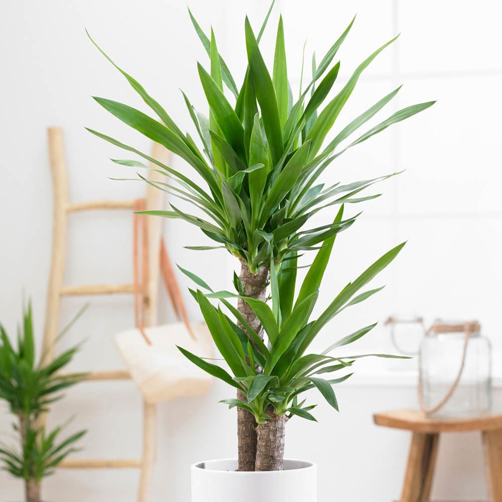 One of the few houseplants that thrive in full sun and partial shade, the Yucca is an ideal plant for a bright room or the conservatory - and a great plant for a Mediterranean feel on the patio during the summer. Grown for its foliage and shape, it really does resemble a tree and makes an instant and dramatic impact when given pride of place in a room. These iconic plants never fail to gain attention in any space! One of the easiest houseplants to grow and care for, the yucca (Yucca elephantipes) is an exceptionally robust houseplant requiring very little water - perfect if you don't have much time or usually forget about them! You will receive a plant with a double trunk in a 17cm pot. Approx 70cm tall (including the pot). Please note: the decorative pot shown in the images is not included. As with all houseplants, keep away from children and pets, and take care when handling.
