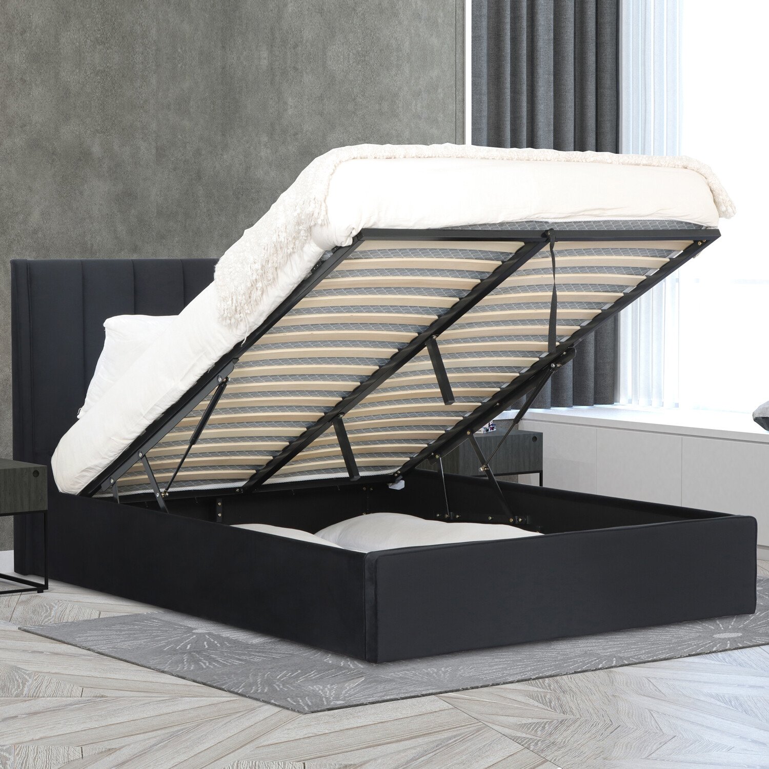 With its simple and sleek style, the Willow Ottoman Bed will give your bedroom a sense of grace. Beautifully upholstered in a black brushed velvet, covering across the lower base and headboard. This bed is designed with ottoman storage, ideal for keeping bedsheets or out-of-season clothes to help you keep your bedroom neat and tidy. The high-rise headboard adds a grande touch, making it the perfect addition to a master bedroom. This bed is built from sturdy yet affordable materials, allowing you to bring high-class elegance into your home for a reasonable price. It will prove easy to assemble, leading to a beautiful night's sleep the first time you try it and every night after that.