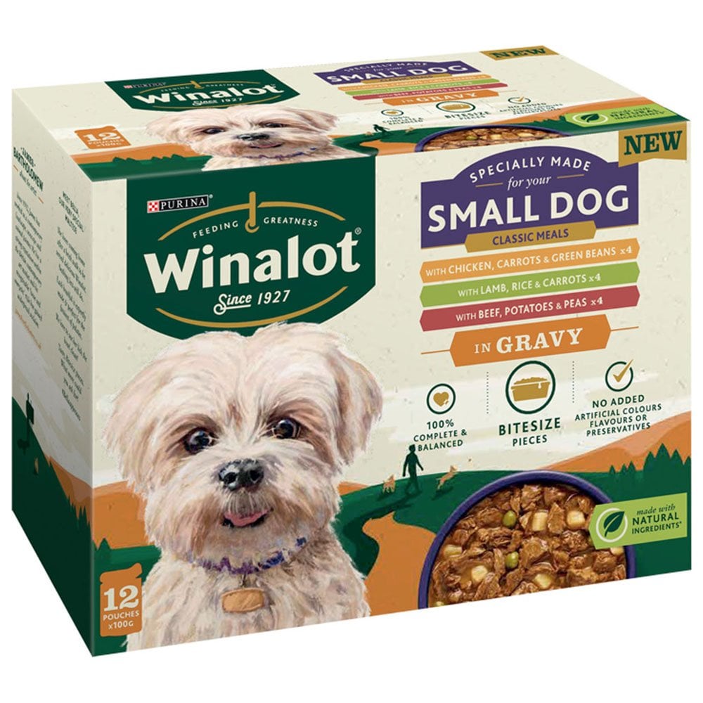 Cater to your best friend's nutritional needs with Purina Winalot Mixed in Gravy Small Dog Food Pouch. It comes in a 12 x 100g convenient pouch in hearty meals made with succulent meaty chunks and quality ingredients. Specially made for your small dog - it is 100% complete and balanced. These bitesize pieces in delicious gravy is free of added artificial colours, preservatives and flavourings. Feeding guidelines: Recommended Daily Amount: Adult Dog Weight (kg): 1 to 5 kg; Wet Pouches Only: Wet Food Pouches: 2 to 6; Wet Pouches + Dry Food: Wet Food Pouches: 1 to 2; g Dry Dog: 15 to 75. Adult Dog weight (kg): 5 to 10 kg; Wet Pouches Only: Wet Food Pouches: 6 to 9; Wet Pouches + Dry Food: Wet Food Pouches: 2 to 3; g Dry Dog: 70 to 120. These amounts are averages based on moderately active small dogs at normal environmental temperatures. Individual needs vary and feeding should be adjusted accordingly. Serve at room temperature. Clean, fresh drinking water should be available at all times. The mixed feeding guidelines tables have been calculated using the Bakers Small dog rich in beef with country vegetables. Ingredients: With Chicken, Carrots and Beans: Meat and Animal Derivatives (of which Chicken 4%), Vegetable Protein Extracts, Derivatives of Vegetable Origin, Fish and Fish Derivatives, Vegetables (0.6% Dehydrated Carrots equivalent to 5.4% Carrots and 0.6% Dehydrated Green Beans equivalent to 5.4% Green Beans), Minerals, Various Sugars, Ingredients from Natural Origin. With Lamb Rice and Carrots: Meat and Animal Derivatives (of which Lamb 4%), Vegetable Protein Extracts, Derivatives of Vegetable Origin, Fish and Fish Derivatives, Cereals (1% Uncooked Rice equivalent to 6% Cooked Rice), Vegetables (0.6% Dehydrated Carrots equivalent to 5.4% Carrots), Minerals, Various Sugars, Ingredients from Natural Origin. With Beef Potatoes and Peas: Meat and Animal Derivatives (of which Beef 4%), Vegetable Protein Extracts, Derivatives of Vegetable Origin, Fish and Fish Derivatives, Vegetables (0.8% Dehydrated Potatoes equivalent to 7.2% Potatoes and 0.8% Dehydrated Peas equivalent to 7.2% Peas), Various Sugars, Minerals, Ingredients from Natural Origin. Nutrition: With Chicken, Carrots and Beans: Analytical Constituents: Moisture 80%, Protein 10.5%, Fat content 3%, Crude ash 1.8%, Crude fibres 1.2%, Additives: Nutritional Additives: IU/kg: Vit. A: 1158, Vit. D3: 160, mg/kg: Taurine: 530, 3b103: (Fe: 14), 3b202: (I: 0.4), 3b405: (Cu: 1), 3b503: (Mn: 1.9), 3b605: (Zn: 20). With Lamb Rice and Carrots: Analytical Constituents: Moisture 80%, Protein 10.5%, Fat content 3%, Crude ash 1.8%, Crude fibres 1.2%, Additives Nutritional Additives: IU/kg: Vit. A: 1158, Vit. D3: 160, mg/kg: Taurine: 530, 3b103: (Fe: 14), 3b202: (I: 0.4), 3b405: (Cu: 1), 3b503: (Mn: 1.9), 3b605: (Zn: 20). With Beef Potatoes and Peas: Analytical Constituents: Moisture 80%, Protein 10.5%, Fat content 3%, Crude ash 1.8%, Crude fibres 1.2%, Additives, Nutritional Additives: IU/kg: Vit. A: 1158, Vit. D3: 160, mg/kg: Taurine: 530, 3b103: (Fe: 14), 3b202: (I: 0.4), 3b405: (Cu: 1), 3b503: (Mn: 1.9), 3b605: (Zn: 20).