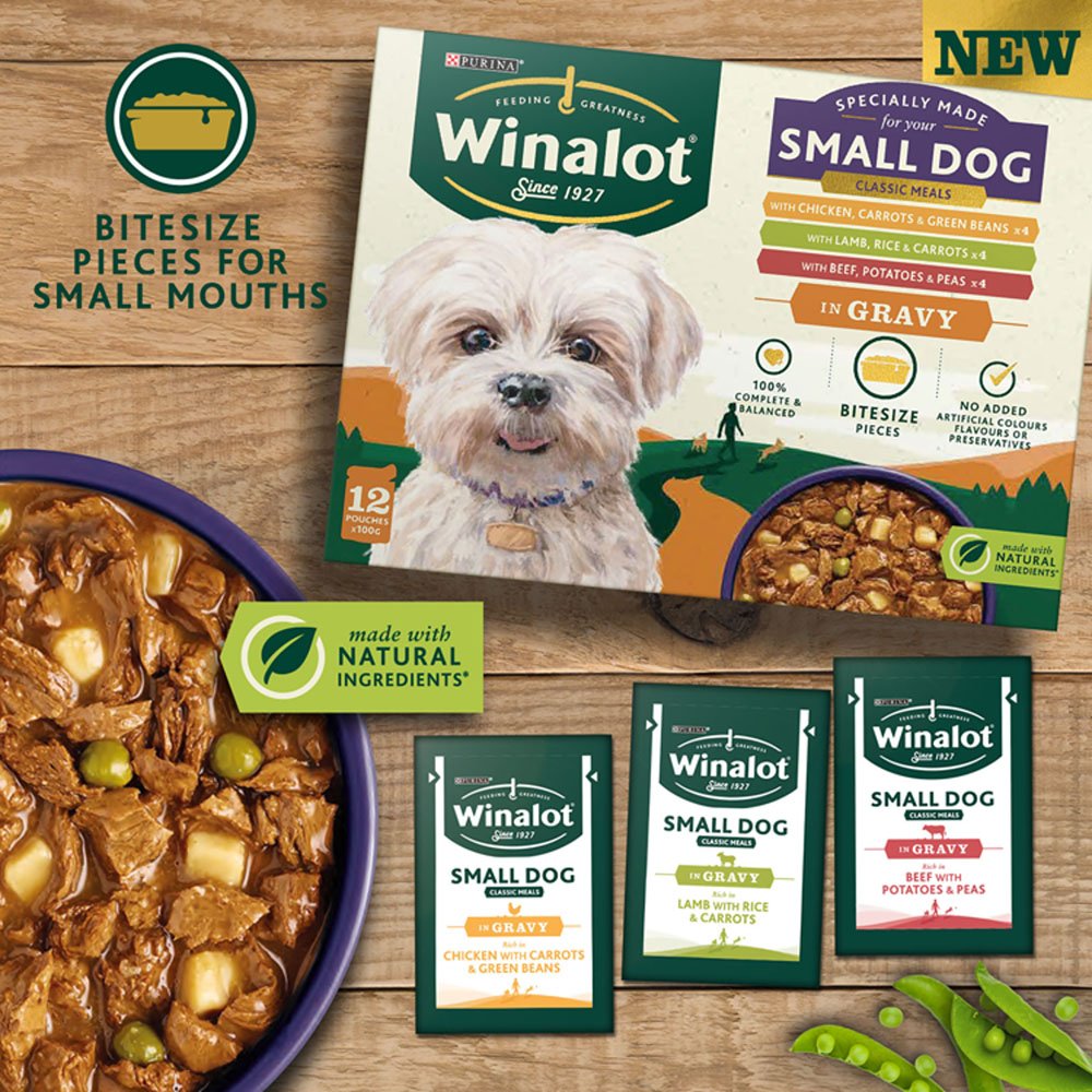 Cater to your best friend's nutritional needs with Purina Winalot Mixed in Gravy Small Dog Food Pouch. It comes in a 40 x 100g convenient pouch in hearty meals made with succulent meaty chunks and quality ingredients. Specially made for your small dog - it is 100% complete and balanced. These bitesize pieces in a delicious gravy are free of added artificial colours, preservatives and flavourings. Feeding guidelines: Recommended Daily Amount: Adult Dog weight (kg): Adult Dog weight (kg): 1 to 5 kg; Wet Pouches Only: Wet Food Pouches: 2 to 6; Wet Pouches + Dry Food*: Wet Food Pouches: 1 to 2, g Dry Dog: 15 to 70. Adult Dog weight (kg): 5 to 10 kg; Wet Pouches Only: Wet Food Pouches: 6 to 9; Wet Pouches + Dry Food*: Wet Food Pouches: 2 to 3, g Dry Dog: 70 to 120. *The mixed feeding guidelines table has been calculated using the Bakers Small dog rich in beef with country vegetables. These amounts are averages based on moderately active small dogs at normal environmental temperatures. Individual needs vary and feeding should be adjusted accordingly. Serve at room temperature. Clean, fresh drinking water should be available at all times. Ingredients: With Chicken, Carrots and Beans: Meat and Animal Derivatives* (of which Chicken 4%), Vegetable Protein Extracts, Derivatives of Vegetable Origin, Fish and Fish Derivatives, Vegetables (0.6% Dehydrated Carrots equivalent to 5.4% Carrots and 0.6% Dehydrated Green Beans equivalent to 5.4% Green Beans), Minerals, Various Sugars, *Ingredients from Natural Origin. With Lamb Rice and Carrots: Meat and Animal Derivatives* (of which Lamb 4%), Vegetable Protein Extracts, Derivatives of Vegetable Origin, Fish and Fish Derivatives, Cereals (1% Uncooked Rice equivalent to 6% Cooked Rice), Vegetables (0.6% Dehydrated Carrots equivalent to 5.4% Carrots), Minerals, Various Sugars, *Ingredients from Natural Origin. With Beef Potatoes and Peas: Meat and Animal Derivatives* (of which Beef 4%), Vegetable Protein Extracts, Derivatives of Vegetable Origin, Fish and Fish Derivatives, Vegetables (0.8% Dehydrated Potatoes equivalent to 7.2% Potatoes and 0.8% Dehydrated Peas equivalent to 7.2% Peas), Various Sugars, Minerals, *Ingredients from Natural Origin. Nutrition: With Chicken, Carrots and Beans: Analytical Constituents: Moisture 80%, Protein 10.5%, Fat content 3%, Crude ash 1.8%, Crude fibres 1.2%, Additives, Nutritional Additives: IU/kg: Vit. A: 1158, Vit. D3: 160, mg/kg: Taurine: 530, 3b103: (Fe: 14), 3b202: (I: 0.4), 3b405: (Cu: 1), 3b503: (Mn: 1.9), 3b605: (Zn: 20). With Lamb Rice and Carrots: Analytical Constituents: Moisture 80%, Protein 10.5%, Fat content 3%, Crude ash 1.8%, Crude fibres 1.2%, Additives Nutritional Additives: IU/kg: Vit. A: 1158, Vit. D3: 160, mg/kg: Taurine: 530, 3b103: (Fe: 14), 3b202: (I: 0.4), 3b405: (Cu: 1), 3b503: (Mn: 1.9), 3b605: (Zn: 20). With Beef Potatoes and Peas: Analytical Constituents: Moisture 80%, Protein 10.5%, Fat content 3%, Crude ash 1.8%, Crude fibres 1.2%, Additives, Nutritional Additives: IU/kg: Vit. A: 1158, Vit. D3: 160, mg/kg: Taurine: 530, 3b103: (Fe: 14), 3b202: (I: 0.4), 3b405: (Cu: 1), 3b503: (Mn: 1.9), 3b605: (Zn: 20).