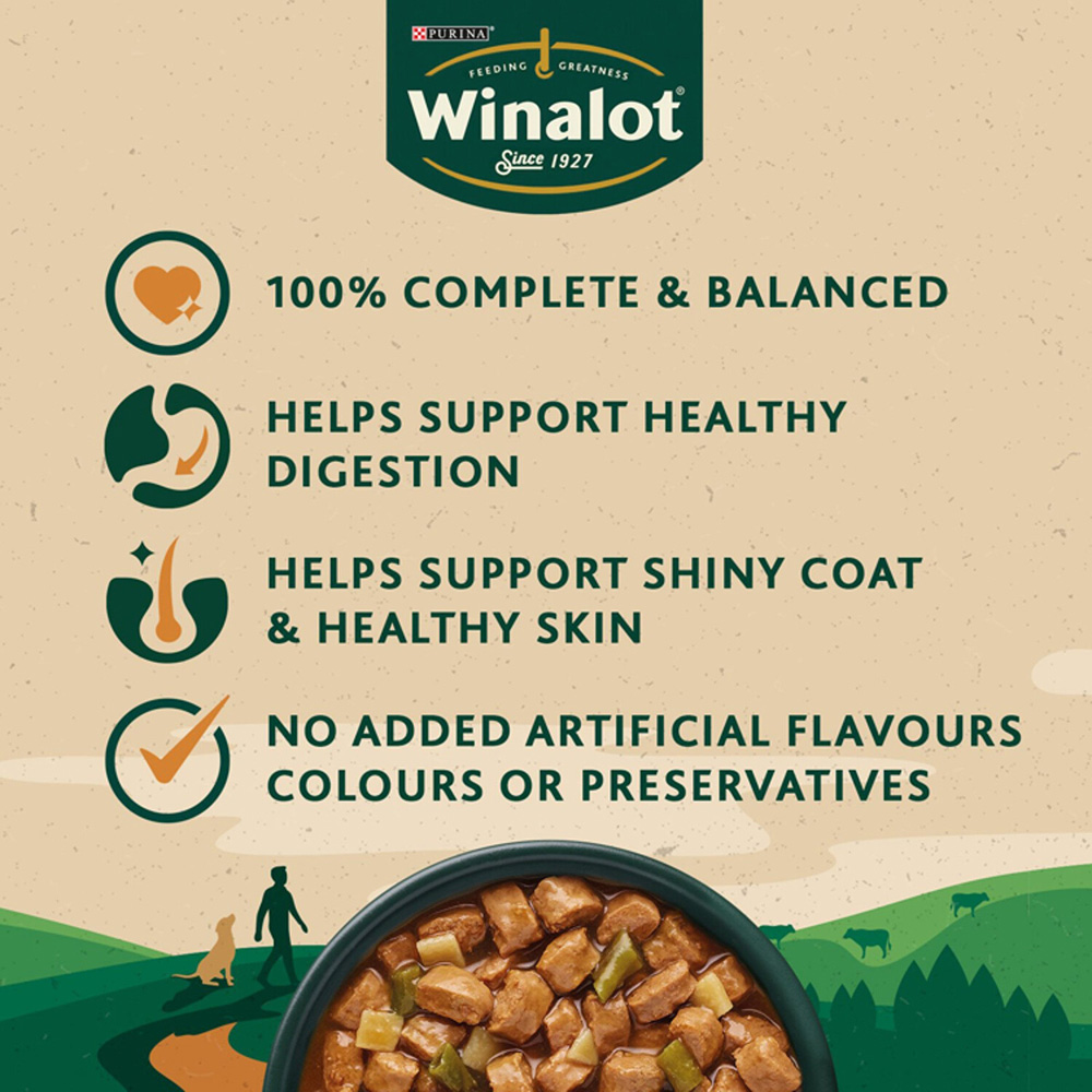 Upgrade your dog's meal with the Winalot Sunday Dinner Gravy Pouches Adult Dog Food 100g 12 Pack. This perfectly portioned meal for your little furry friend comes 100% complete and balanced, with no artificial colours. It is designed to support your dog's shiny coat, healthy skin and smooth digestion. This meal keeps your dog's happy, healthy and full of vitality.