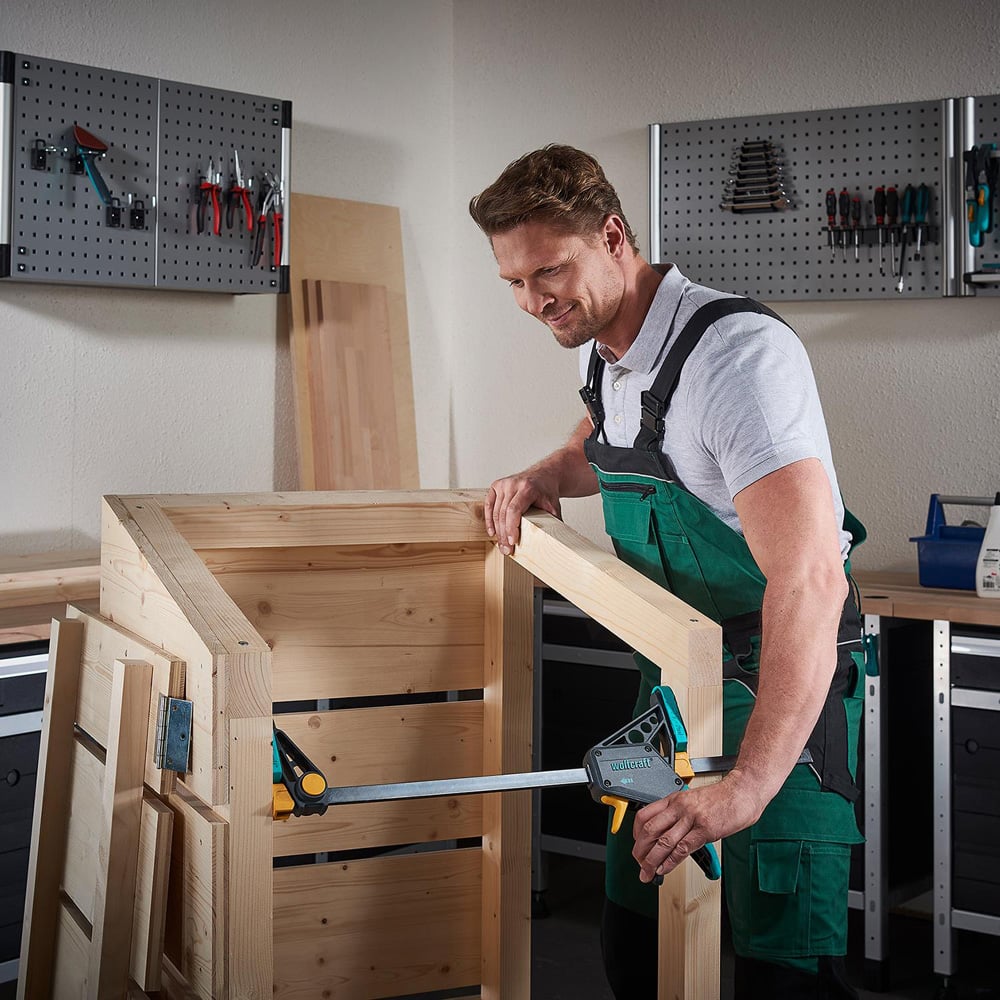 The EHZ PRO one-hand clamp lets you clamp and spread workpieces effortlessly and powerfully with just one hand. The high-quality hardened steel rail ensures long-lasting clamping pressure of up to 120 kg. The large, non-slip clamping areas provide effective protection against scratches for delicate or painted surfaces and also achieve even contact pressure. The adjustable spacing guides ensure easy and precise placement of the one-hand clamp when gluing furniture. Clamping and opening with just one hand thanks to the intelligently designed mechanism fast, safe, and convenient. The high clamping pressure of up to 120kg for professional use ergonomic handle with a non-slip zone for a safe and comfortable handling. High-quality rail for long-lasting clamping pressure. Optimum leverage for very easy release of the clamping pressure. Effortless conversion at the push of a button for spreading applications. Distribution of the clamping pressure for gentle treatment of the workpiece thanks to large rubberised clamping areas and extreme 100 mm throat clearance. Cross groove enables secure clamping of round objects. Adjustable spacing guides protect the workpiece and serve as rests. Clamping pressure: 120kg. Box Contains: EHZ PRO One-Hand Clamp.