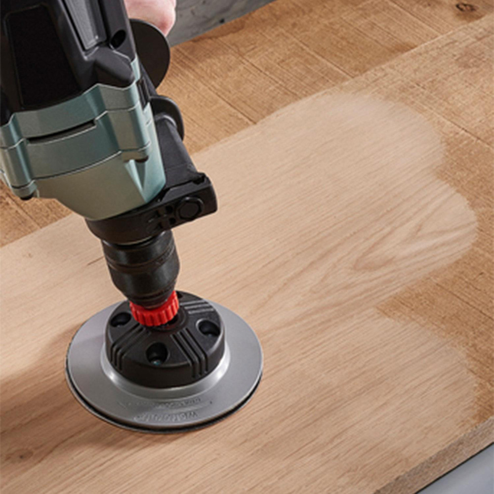 With the universal drill clamp and fixoflex sanding pad, you can convert your power drill into a stationary sander and use it like a disc sander for your workpieces. With its 8 mm round shank, the fixoflex fits in all customary power drills. The backing pad has a practical easy-fix fibre coating to which sanding discs can be attached easily and quickly. With the red locking screw, the axis can be changed from flexible to rigid as needed. For stationary use on a worktop, use the rigid setting. With the universal drill clamp, you can securely fasten the power drill to the table. The clamp screw makes it possible to mount it on tabletops with a thickness of up to 60 mm. Subsequently, fasten the power drill in the mount. It is compatible with all power drills that have a 43 mm Euronorm neck. Depending on the setting of the universal drill clamp, the machine can be positioned vertically or horizontally. Additionally, it can be rotated 360 degrees to flexibly position the power drill together with the fixoflex. Round shank, 8mm, for quick locking in the drill chuck and high compatibility backing pad, 125 mm, easy-fix fibre coating, for easily attaching the sanding discs. Steel disc for a long life. Elastic foam rubber coating simplifies the sanding of contours. Adjustable from flexible to rigid for safe use in universal drill clamp. Universal drill clamp, plastic, rotatable. Euronorm collar, compatible with all power drills that have a 43 mm Euronorm neck clamp screw for mounting on tabletops with a thickness of up to 60mm. 360-degree rotatable for flexible positioning of the mounted machine. Two possible positions for the mount, for horizontal or vertical use of the drill. Set Includes: Fixoflex sanding pad, 125 mm. Universal drill clamp, Plastic, rotatable. 12 Fixoflex easy fix sanding discs for wood and metal, 125 mm.