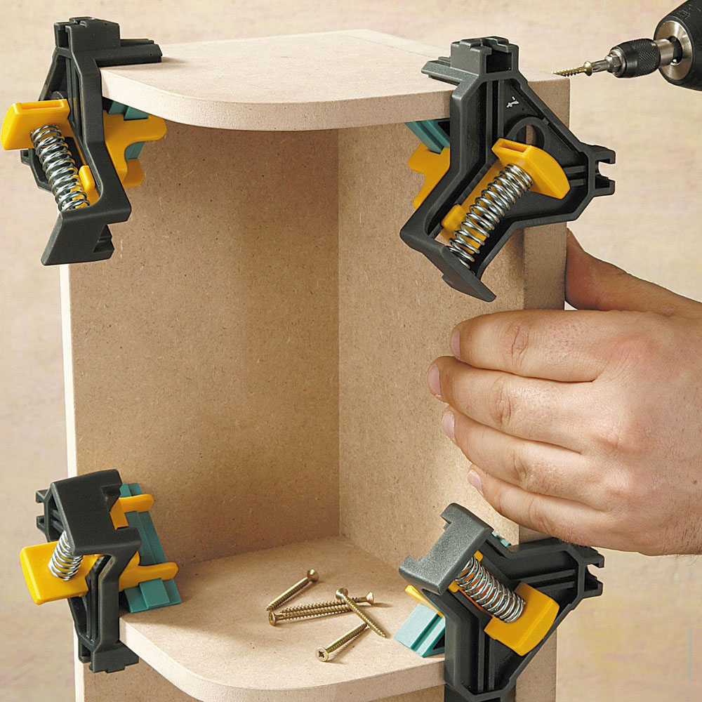 With the corner clamps, you are optimally equipped to fasten and clamp shelves, picture frames and pieces of furniture. The set includes two corner clamps for boards with a thickness of 10 - 22 mm and can be mounted and released with only one hand. Thanks to the spring mechanism, they automatically adapt to the board thickness. It is also possible to clamp together boards with different thicknesses. The clamping surfaces have a soft, non-slip contact surface that fastens the workpiece firmly in place without making pressure marks. Two practical mounting aids for screwing or glueing boards together at a 90 degree angle. For quick and easy fixing of boards and frames at a 90 degree angle, for example when assembling shelves, small cupboards or frames mounting aid for screwing or glueing boards together for corner and T-butt joints, even with different board thicknesses one-hand operation - keeps the second hand free for the workpiece. Box Contains: Wolfcraft Corner Clamps Project Set, Yellow.